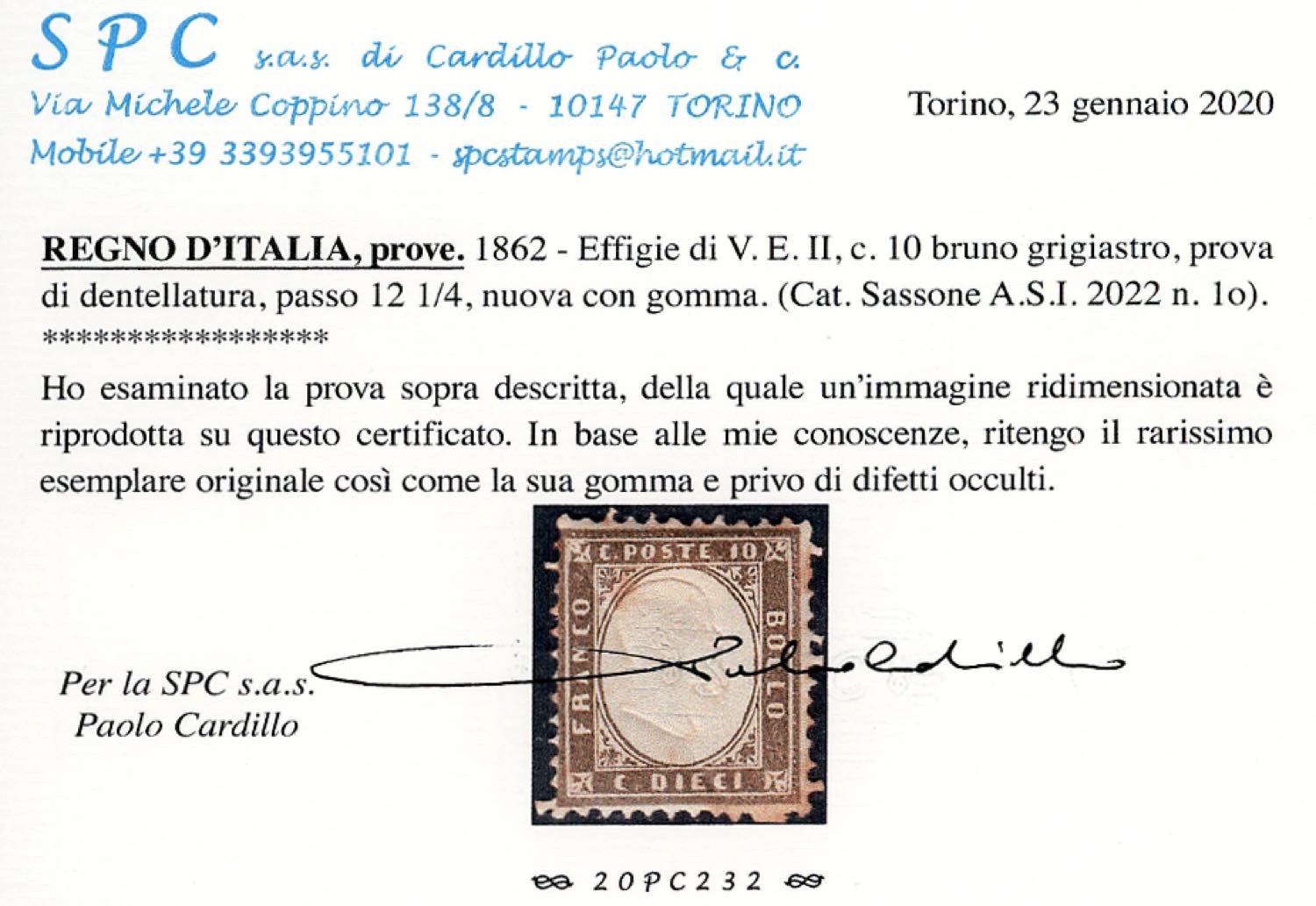 1862 - 10 cent. bruno grigiastro, dentellatura di prova 12 1/4 eseguita dalla tipografia Susse (1o), gomma originale, difetti. Raro. Cert. Cardillo. (cat.Sassone € 12.000 come difettoso).