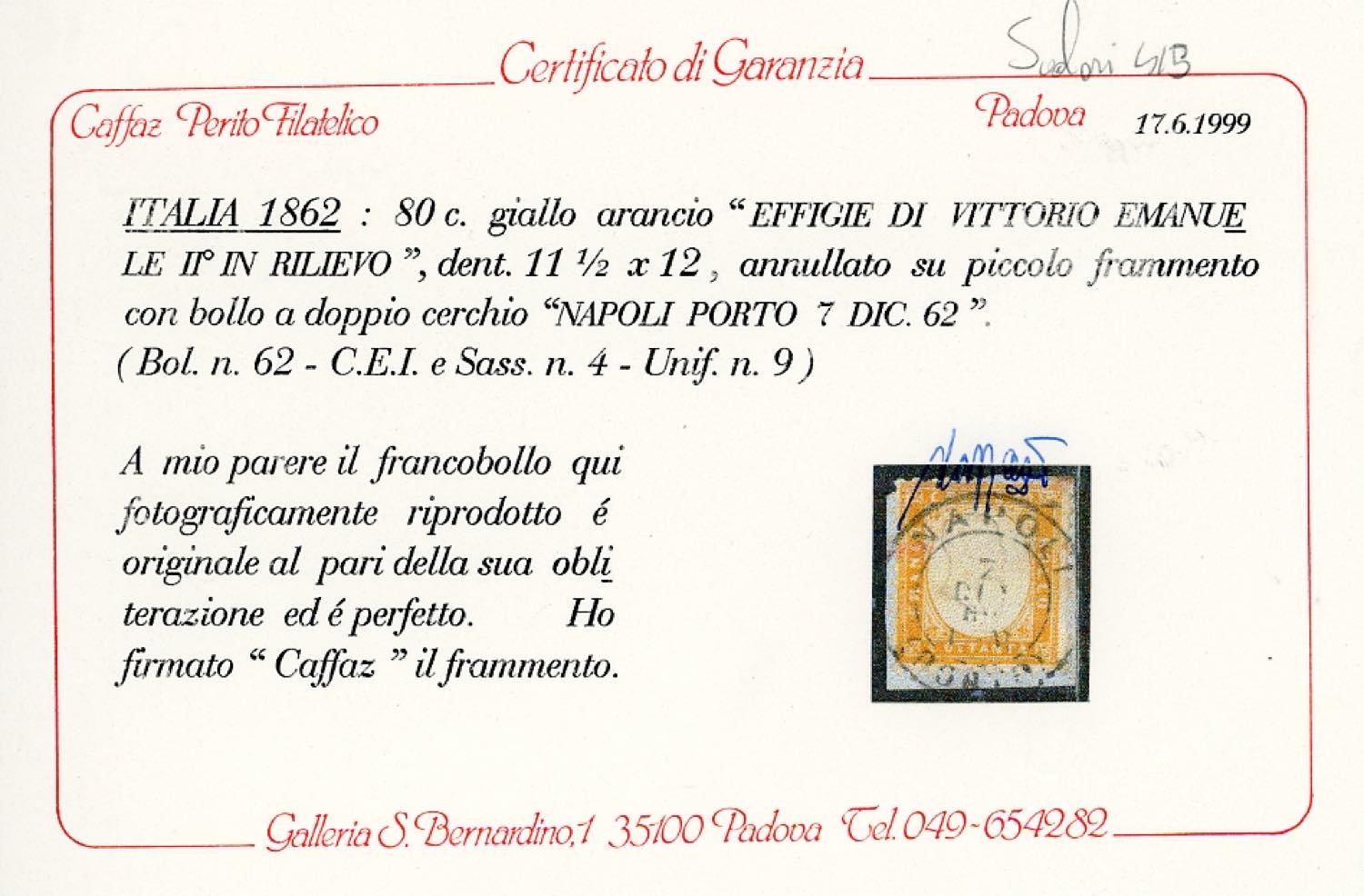 1862 - 80 cent. giallo arancio (4), perfetto, usato su frammento a Napoli il 7/12/1862. Bello e raro! Cert. Caffaz.