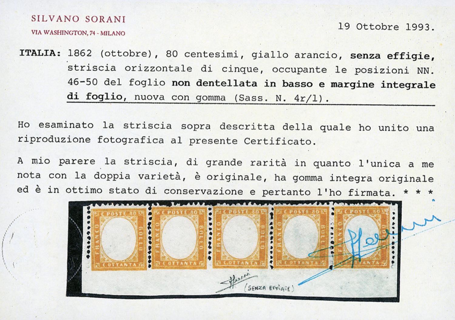 1862 - 80 cent. giallo arancio, SENZA EFFIGIE, non dentellato in basso e con margine integrale di foglio, pos. 48 (4ra), gomma integra, buono stato. Rarità del settore, cinque esemplari noti! E.Diena, cert. Ferrario e fotocopia cert. Sorani della striscia di provenienza.