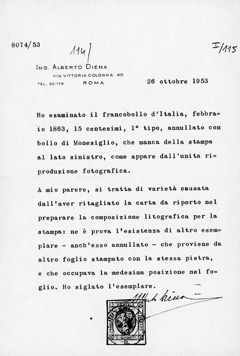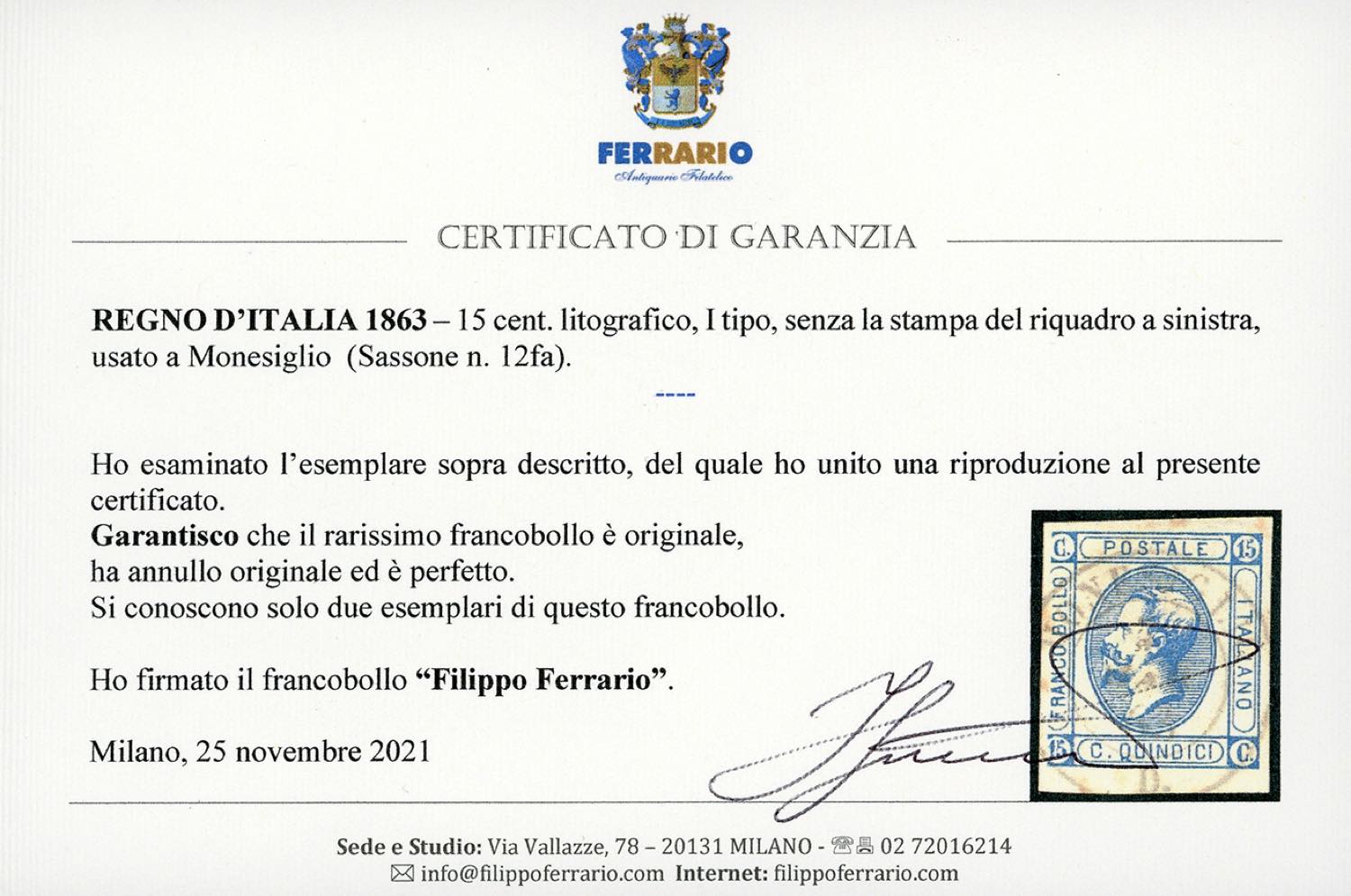 1863 - 15 cent. Litografico, I tipo, senza la stampa del riquadro a sinistra (12fa), perfetto, usato a Monesiglio. Rarissimo, DUE SOLI ESEMPLARI NOTI. Fotocopia cert. Diena e Ferrario.