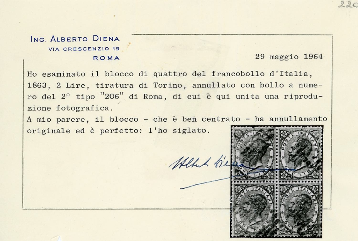 Lotto 899 - 1863 - 2 lire De La Rue, tiratura di Torino (T22), blocco ...