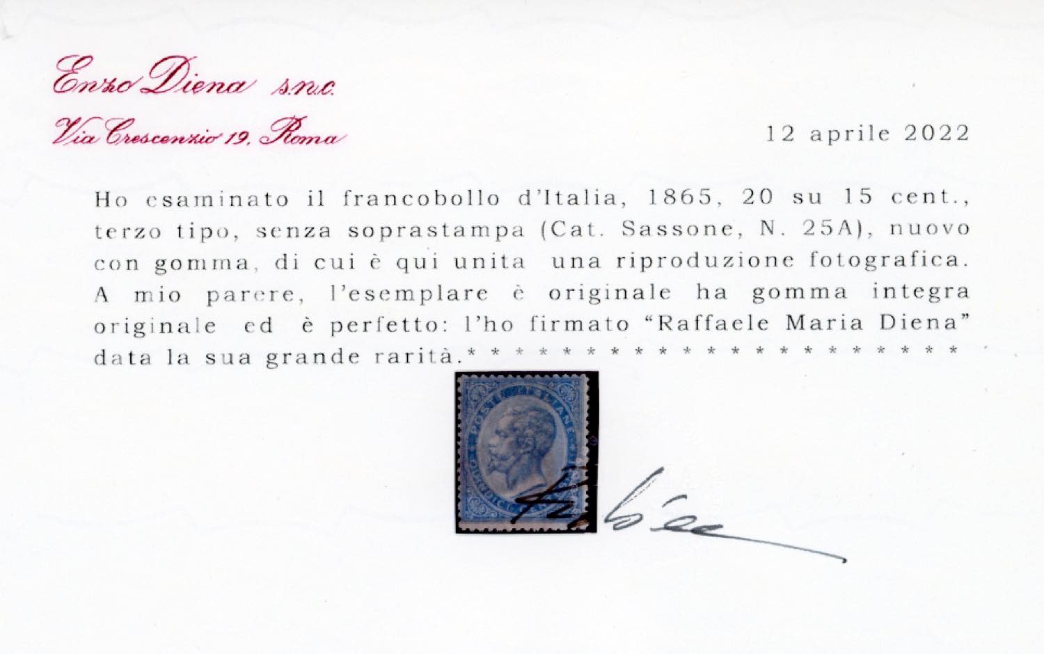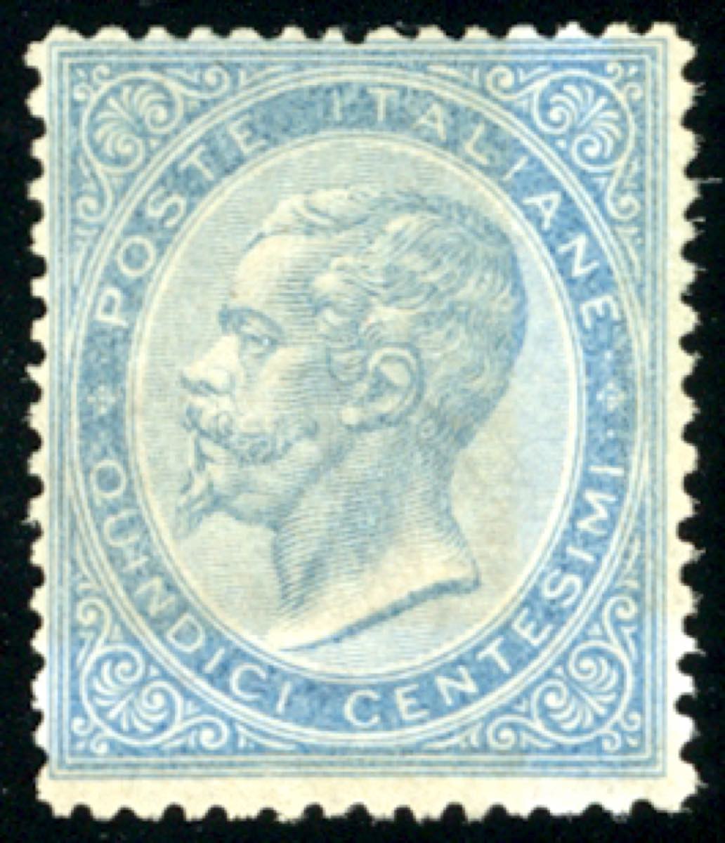 1865 - 20 su 15 cent. celeste, ferro di cavallo del III tipo, SENZA SOPRASTAMPA (25A), nuovo, gomma originale integra, perfetto. Presenta evidente spostamento del fondo di sicurezza, varietà non segnalata su questo già rarissimo francobollo. Molto fresco, buona/ottima centratura. Rarità del Regno d'Italia. Cert. Diena. (cat. 67.500/101.250 €)