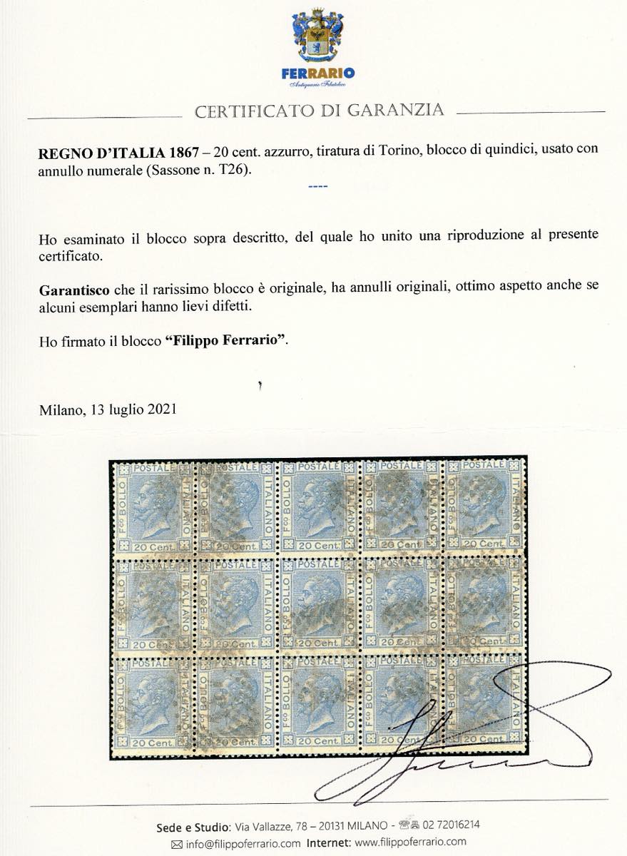 1867 - 20 cent. azzurro, tiratura di Torino (T26), blocco di 15 esemplari usato, lievi difetti su alcuni esemplari, ottimo aspetto. Rarissimo! Cert. Ferrario.