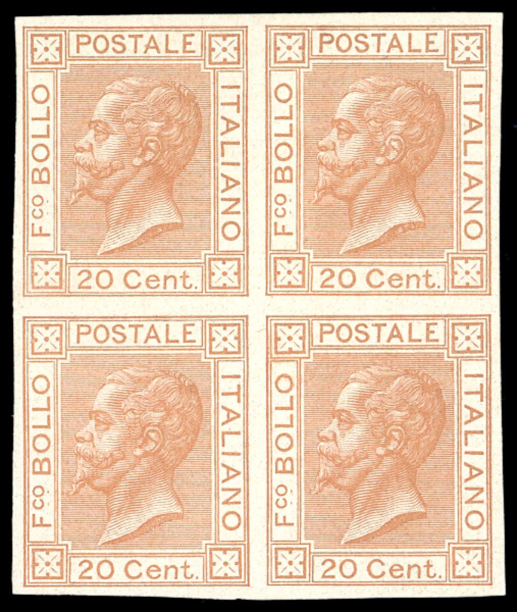 1877 - 20 cent. ocra arancio, prova d'archivio, non dentellata (P28), blocco di quattro, senza gomma, lieve grinza sugli esemplari ... Leggi tutto