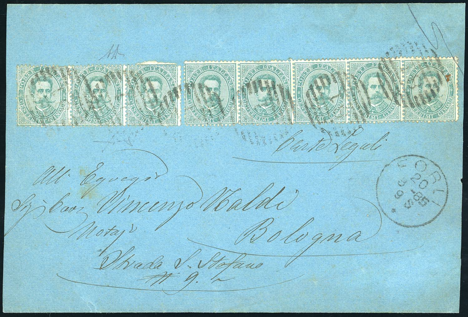 1885 - 5 cent. Umberto I (37), striscia di cinque e di tre, perfette, su frontespizio di fascetta di carte legali da Forlì 20/8/1885 a Bologna. Pregevole porto multiplo di manoscritti. A.Diena, Fiecchi.