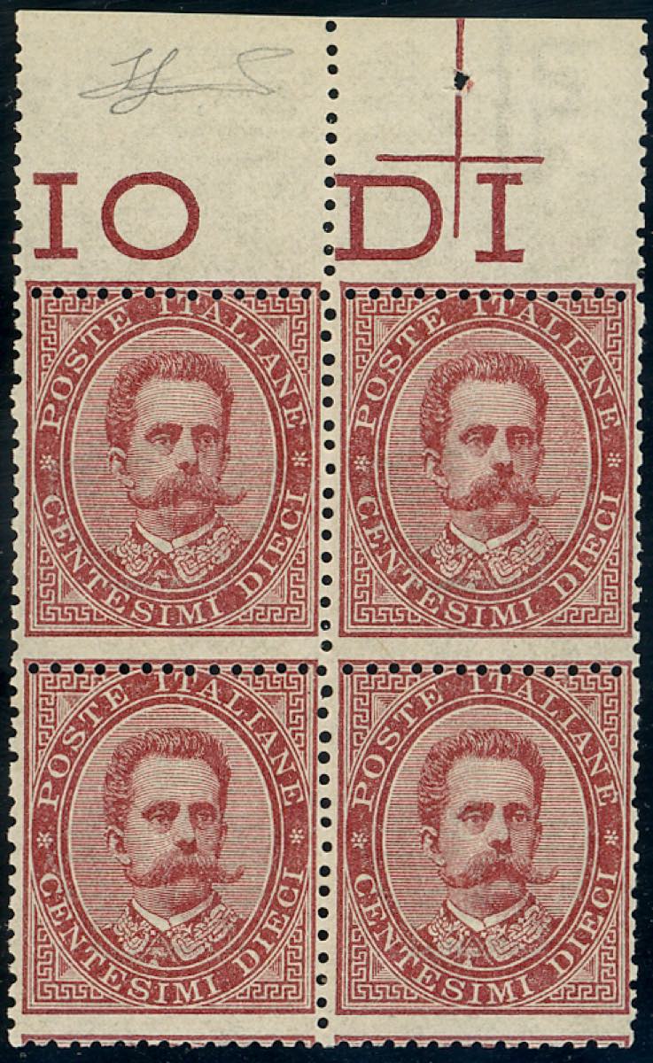 Lotto 922 - 1879 - 10 cent. Umberto I (38), blocco di quattro, bordo di ...