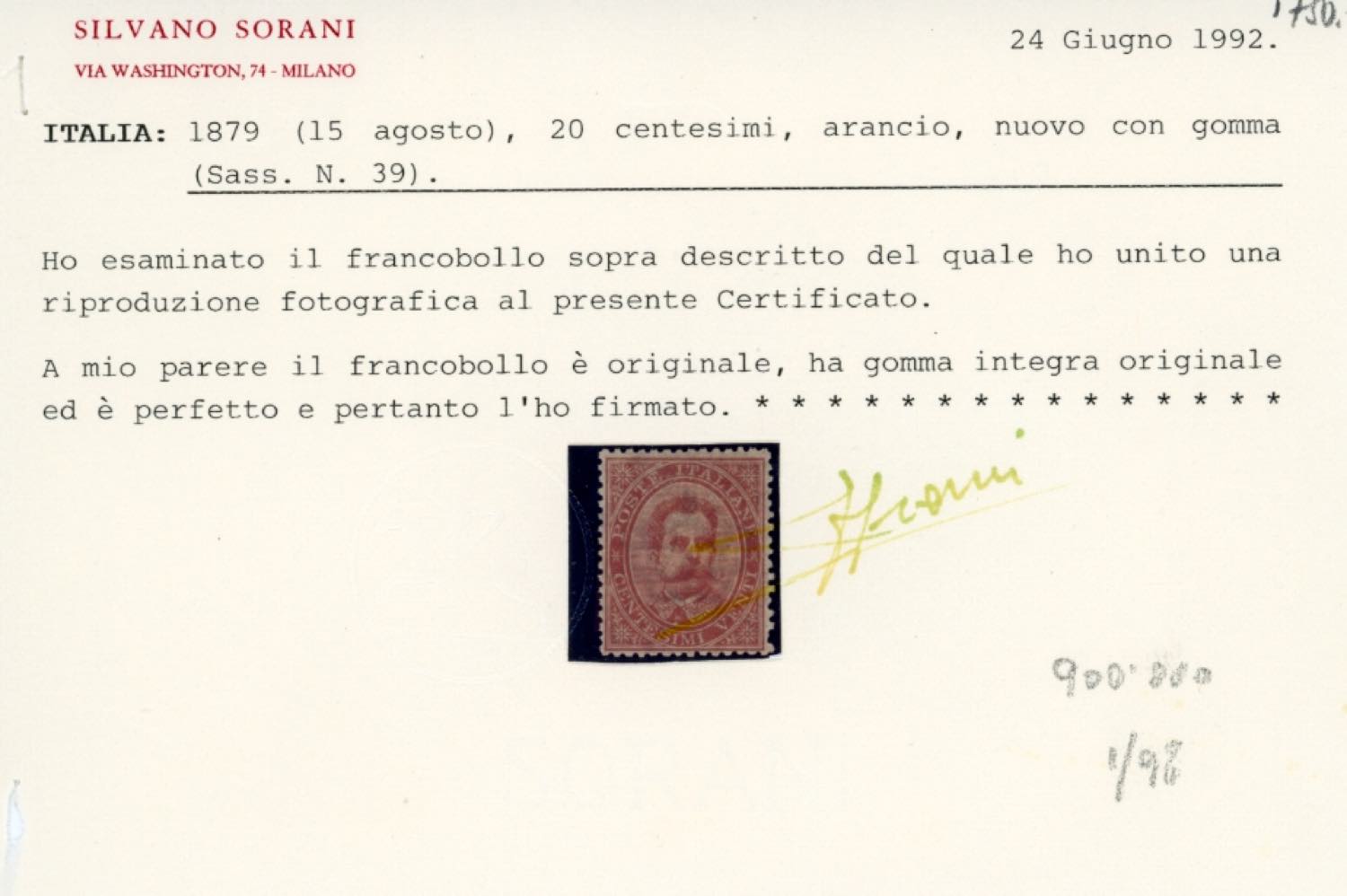 Lotto 925 - 1879 - 20 cent. Umberto I (39), ottima centratura, gomma ...