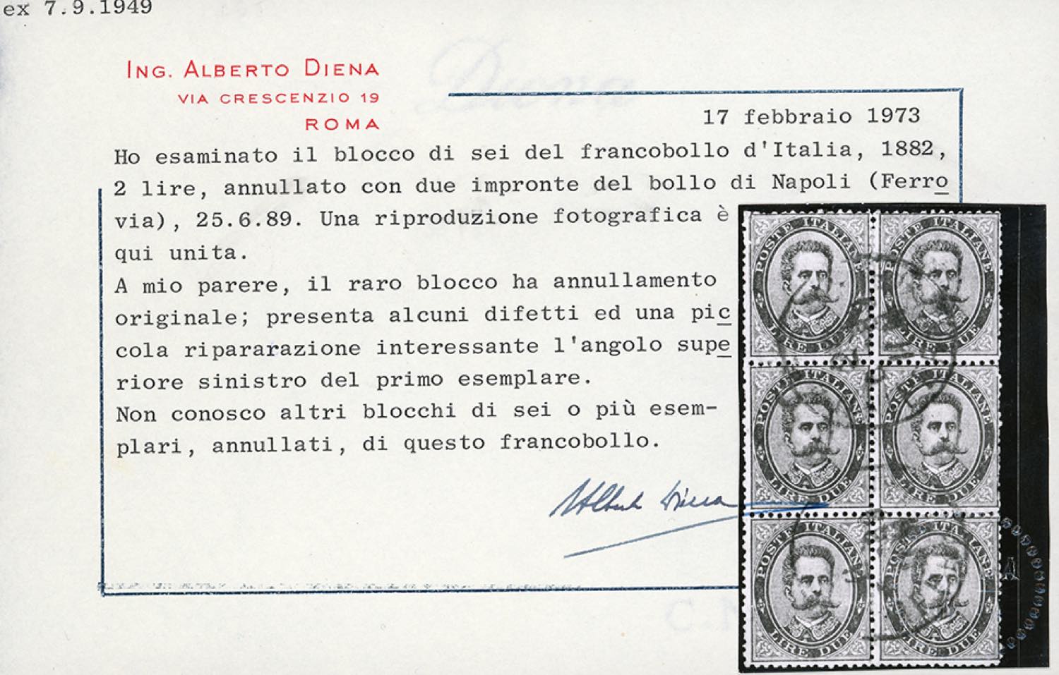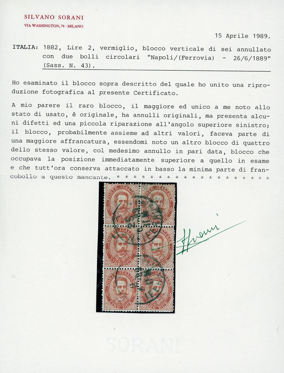 1879 - 2 lire Umberto I (43), blocco di sei esemplari usati, alcuni difetti e una piccola riparazione all'angolo superiore sinistro. GRANDE RARITA', MASSIMO BLOCCO NOTO USATO. Si conoscono solo altri due blocchi di quattro usati. Cert. Diena, Sorani (Sassone quota la quartina € 45.000).