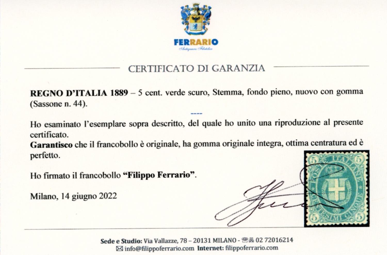 1899 - 5 cent. Stemma (44), ottima centratura, gomma originale integra, perfetto. Bello. A.Diena, cert. Ferrario.
