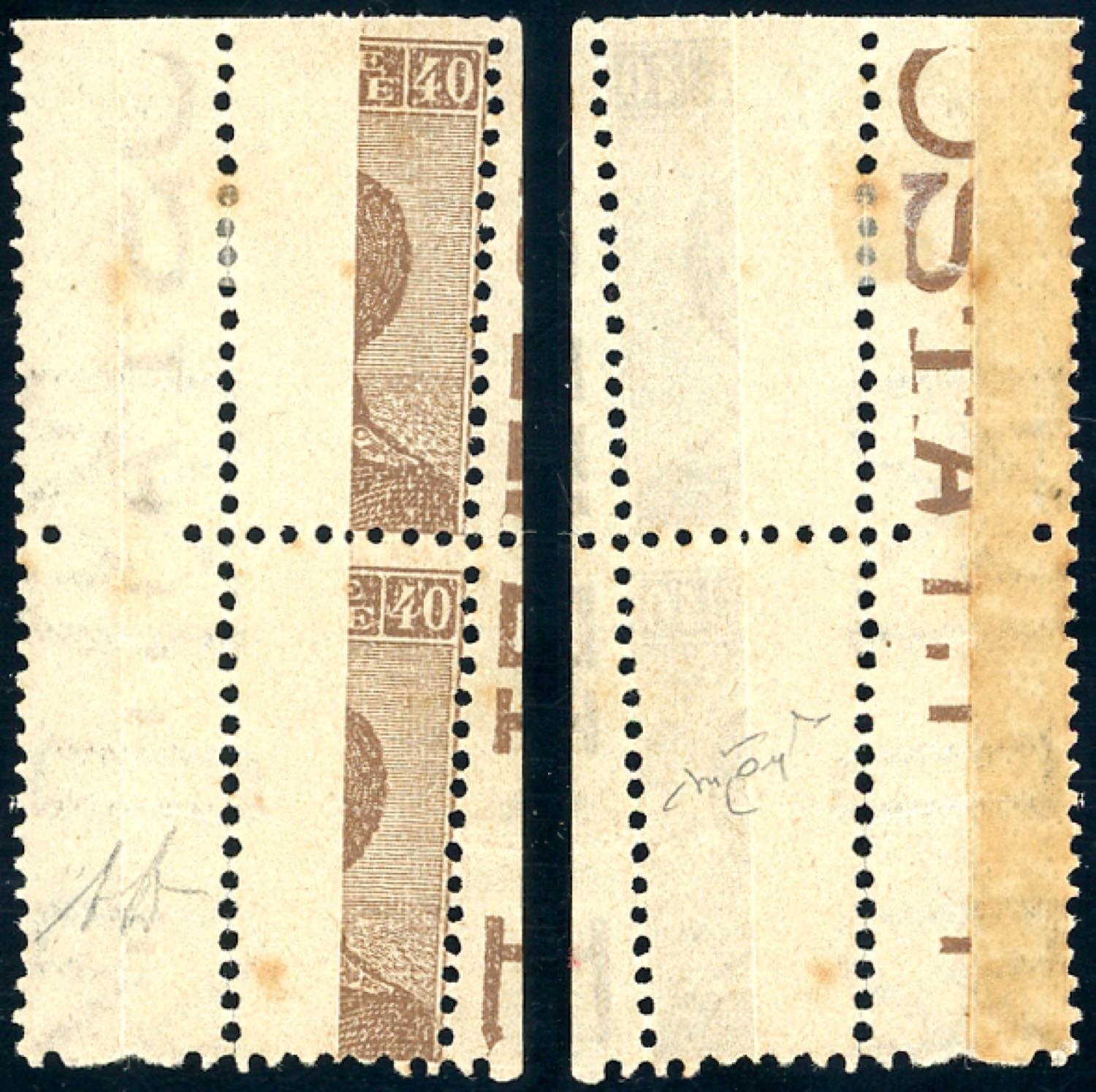 1908 - 40 cent. Michetti (84), stampa incompleta e dentellatura anomala causate da una piegatura del foglio, gomma originale, lievi ossidazioni. Bella e interessante varietà.