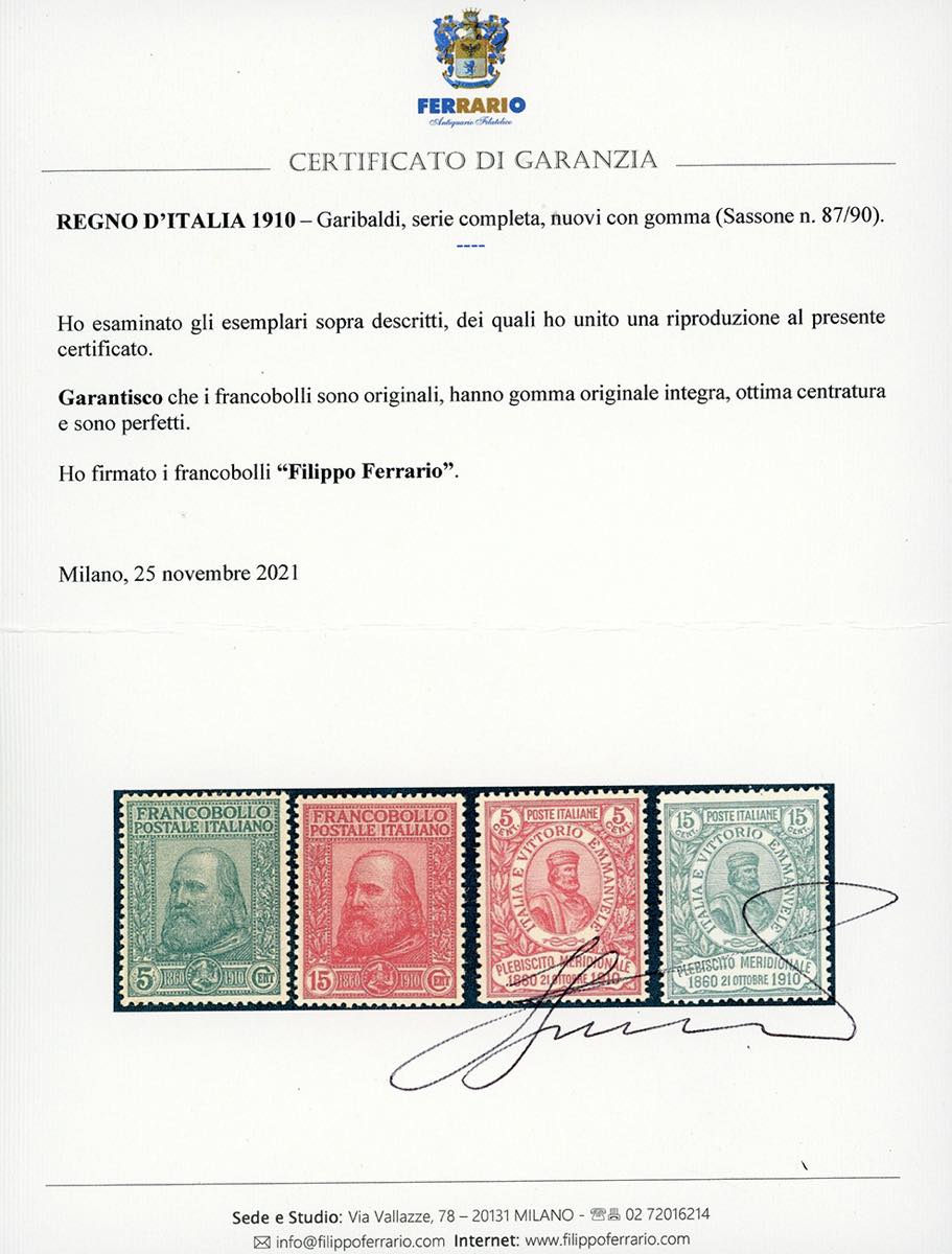 1910 - Garibaldi, serie completa (87/90), nuovi, gomma originale integra, perfetti. Splendidi, ottima centratura. Cert. Ferrario.
