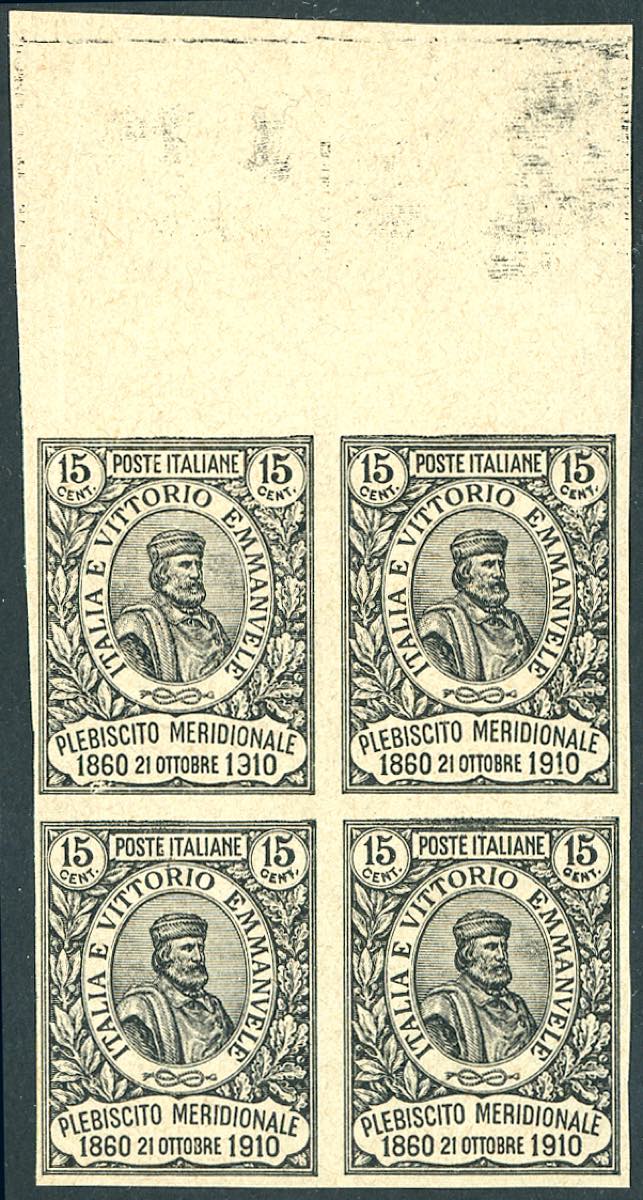 1910 - 15 + 5 cent. Garibaldi (90), prova di macchina in nero su carta spessa grigiastra, non dentellata e senza gomma come sempre, blocco di quattro, bordo di foglio, perfetto.
