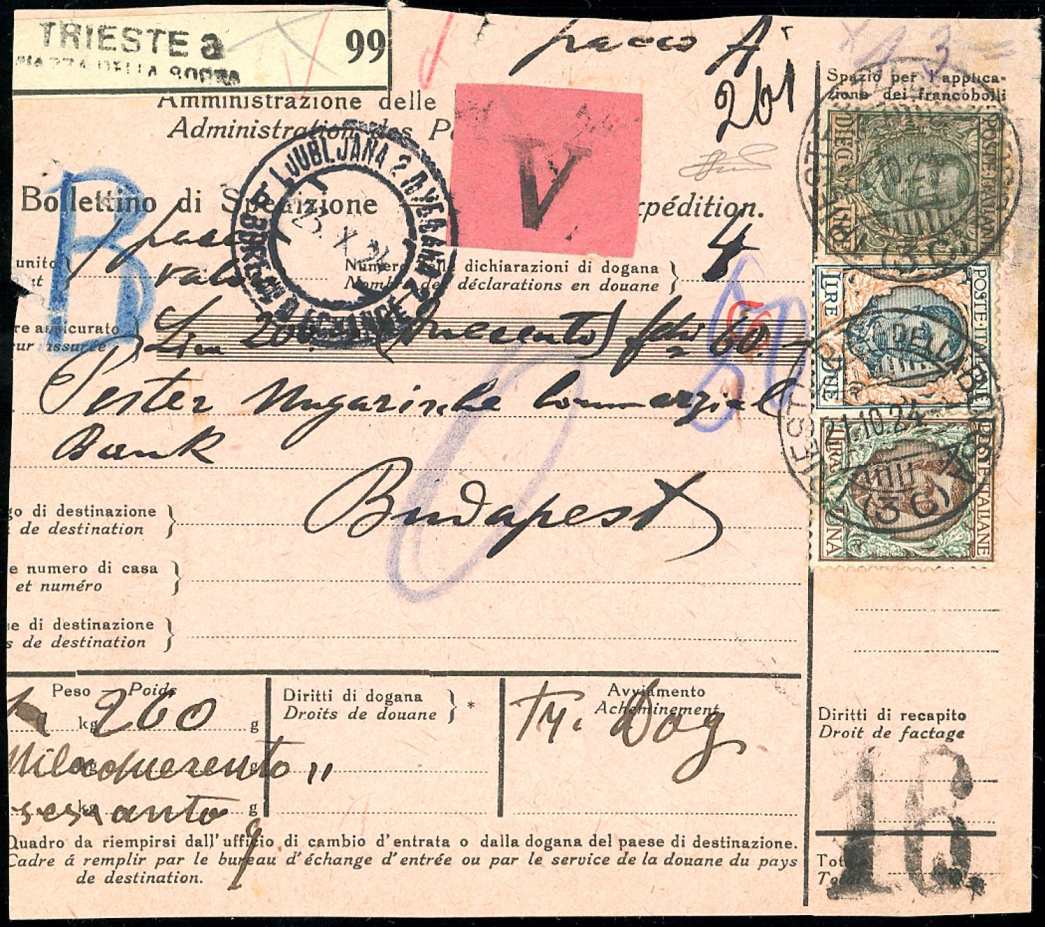 1924 - 10 lire, 1 lira, 2 lire Floreale (91,77,150),perfetti, su bollettino pacco da Trieste 21/10/1924 a Budapest. Raro. Ferrario.