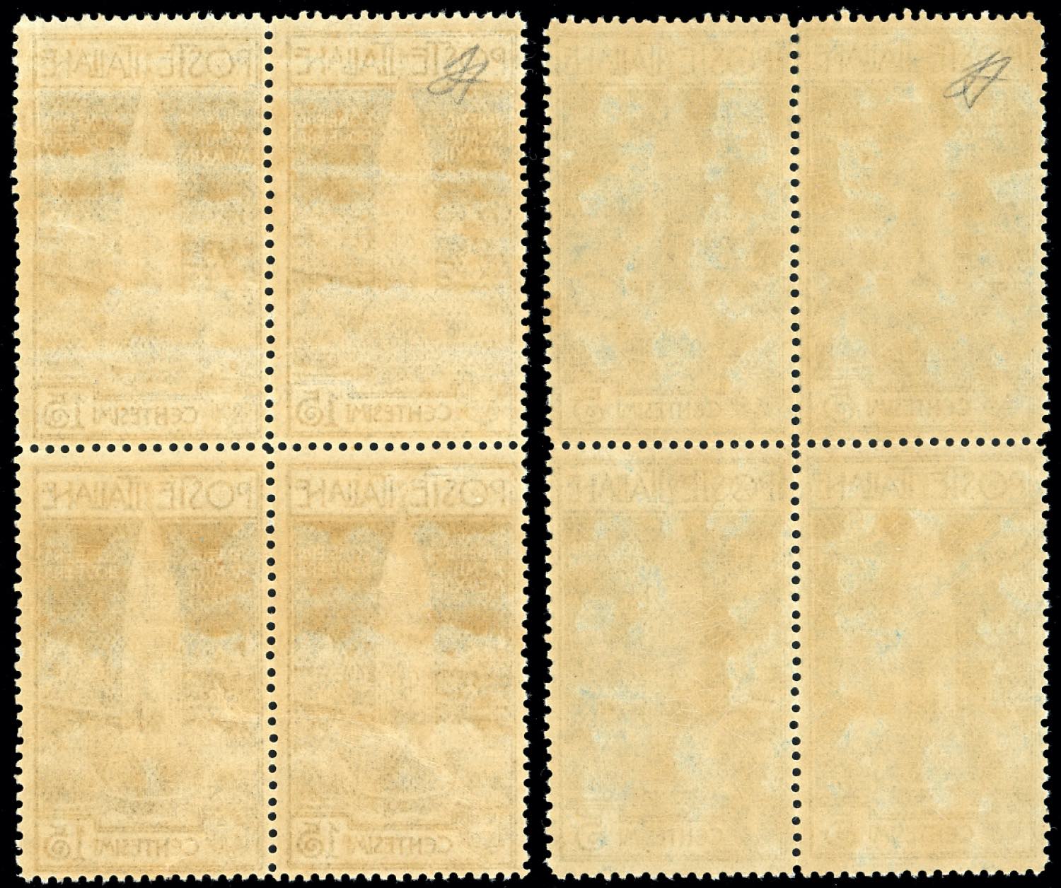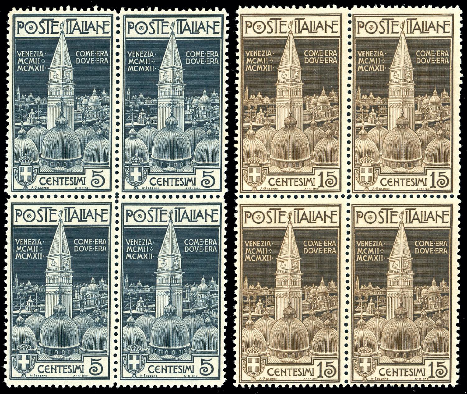 1912 - Campanile di Venezia, serie completa (97/98), buona centratura, blocchi di quattro, gomma originale integra, perfetti. Ferrario.