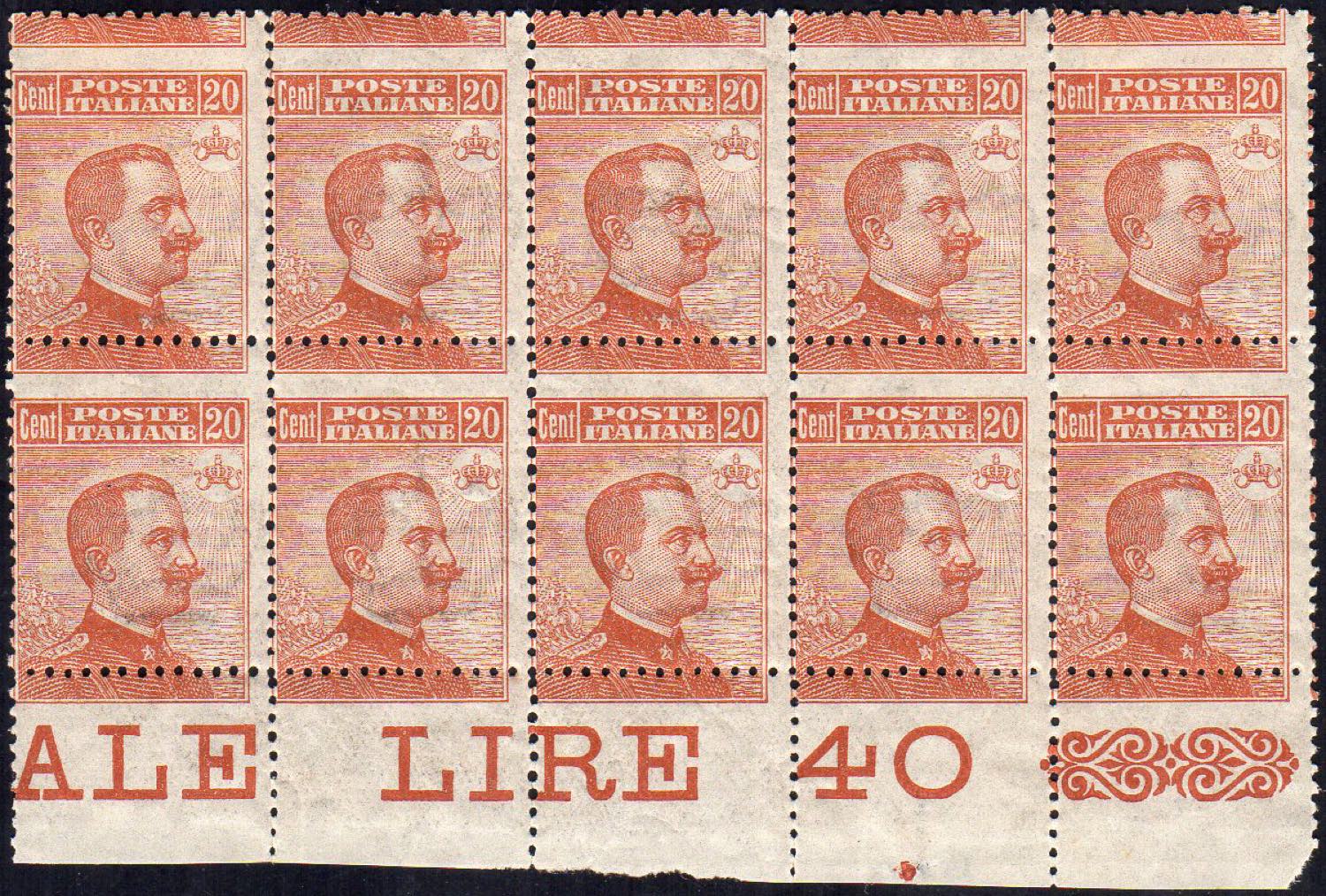 1917 - 20 cent. Michetti, con filigrana, dentellatura orizzontale fortemente spostata in alto (109k), blocco di dieci, bordo inferiore di foglio, gomma originale, integra per otto esemplari. Bello. Ferrario.