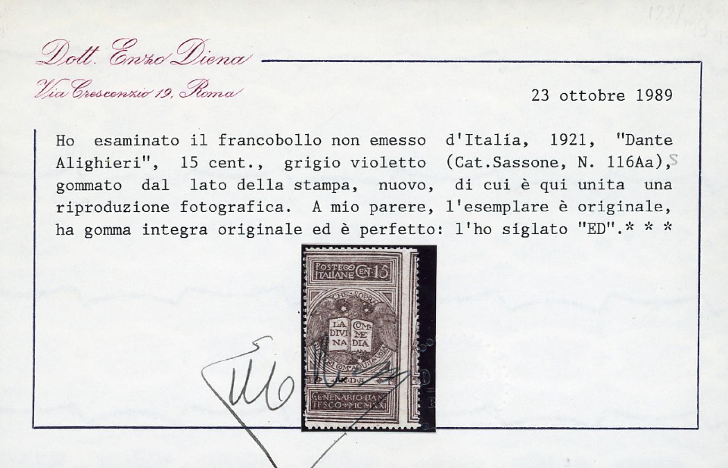 1921 - 15 cent. grigio violetto Dante, non emesso, gommato al recto (116Aas), perfetto, gomma originale integra. Estremamente raro e sottoquotato, pochi esemplari esistenti. Ferrario, cert. Diena.
