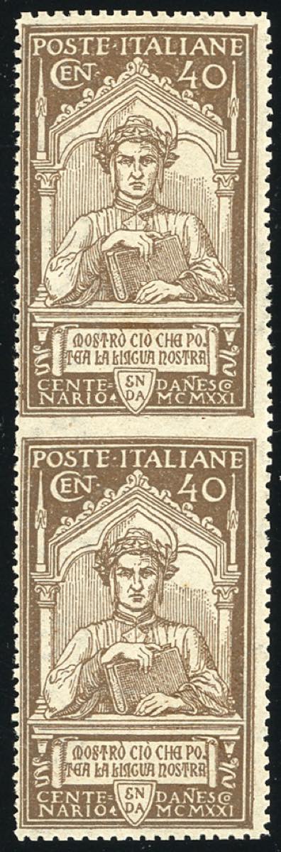 1921 - 40 cent. Dante, coppia verticale non dentellata al centro (118), gomma originale, integra per l'esemplare inferiore, perfetta. Bella ... Leggi tutto