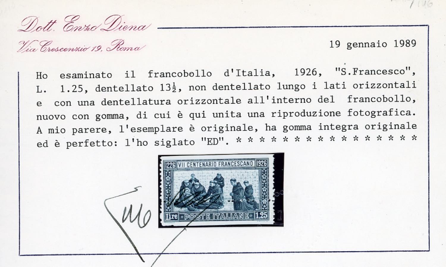 1926 - 1,25 lire San Francesco, dent. 13 1/2 (196), non dentellato orizzontalmente e con una dentellatura orizzontale al centro del francobollo, gomma originale integra, perfetto. Non catalogato. Raybaudi, cert. E.Diena.