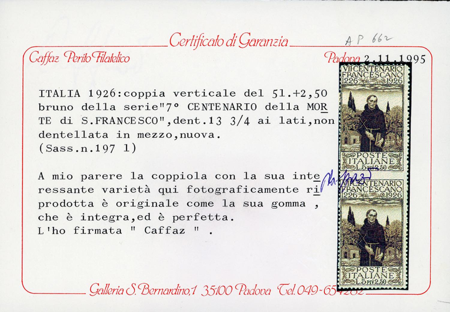 1926 - 5 + 2,50 lire San Francesco, coppia verticale non dentellata al centro (197l), gomma originale integra, perfetta. Cert. Caffaz.