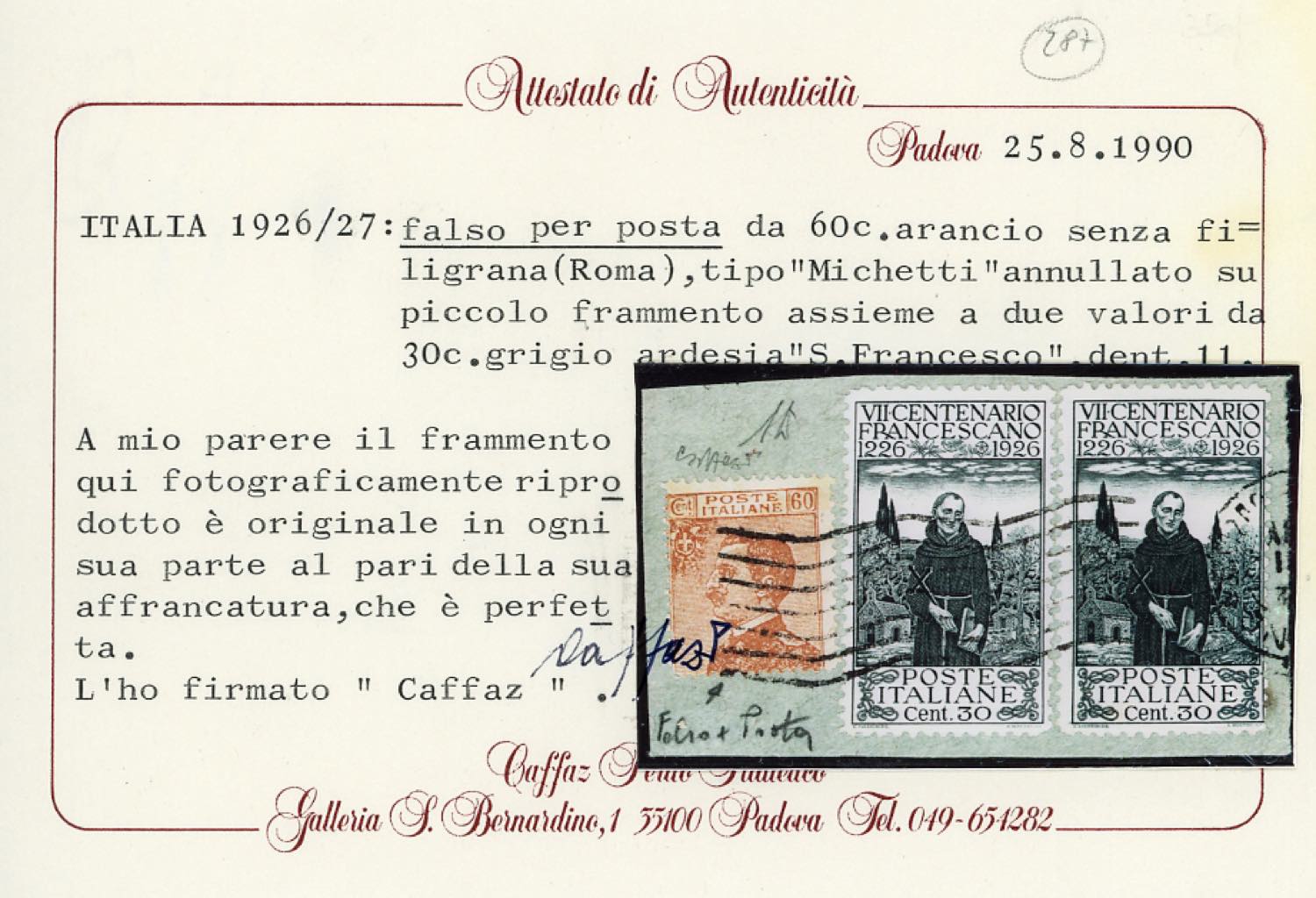 1927 - 60 cent. Michetti, falso per posta di Roma, 30 cent. S.Francesco, dent. 11 (F205,198), perfetti, usati su frammento. Uso molto raro, si conoscono solo due esemplari usati su frammento e due su busta di questo falso. A.Diena, cert. Caffaz.