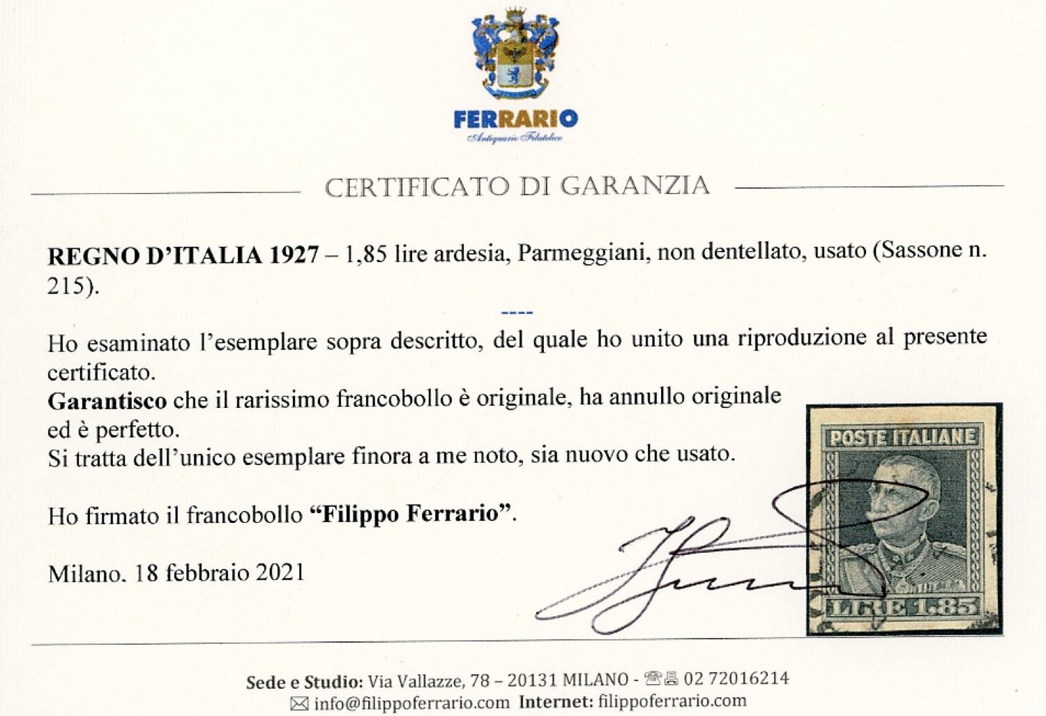 1927 - 1,85 lire Parmeggiani, non dentellato (215c), usato, perfetto. UNICO ESEMPLARE NOTO, sia nuovo che usato, di questa varietà. Cert. ... Leggi tutto