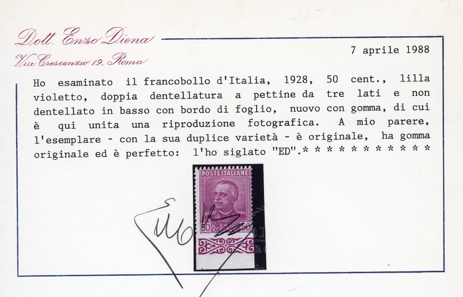 1928 - 50 cent. Parmeggiani, non dentellato in basso e doppia dentellatura sugli altri tre lati (225ba), bordo di foglio, gomma originale, perfetto. Cert. E.Diena.