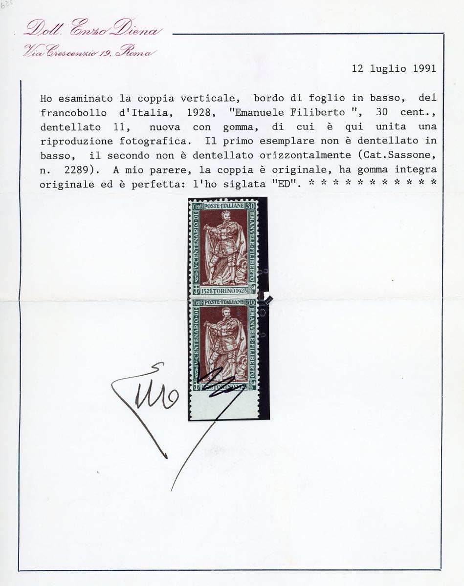 1929 - 30 cent. Emanuele Filiberto, dent. 11, coppia verticale non dentellata al centro e in basso (228o), gomma integra, perfetta. Bella e rara. Cert. E.Diena.