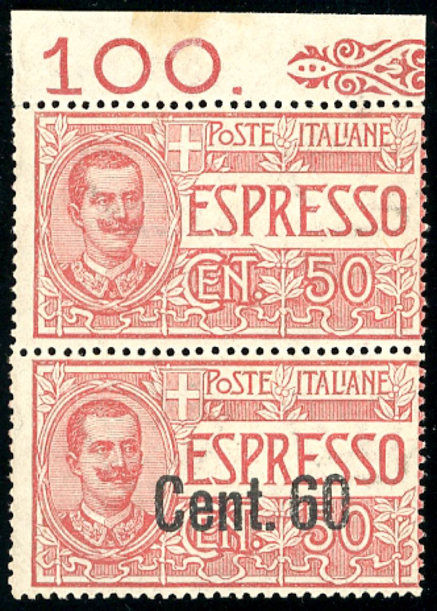 1922 - 60 cent. su 50 cent., coppia verticale, il primo esemplare senza soprastampa (6e), bordo di foglio, gomma originale integra, ... Leggi tutto