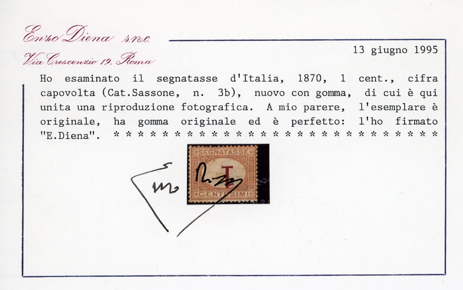 Lotto 1158 - 1870 - 1 cent. ocra e carminio, cifra capovolta (3b), gomma ...