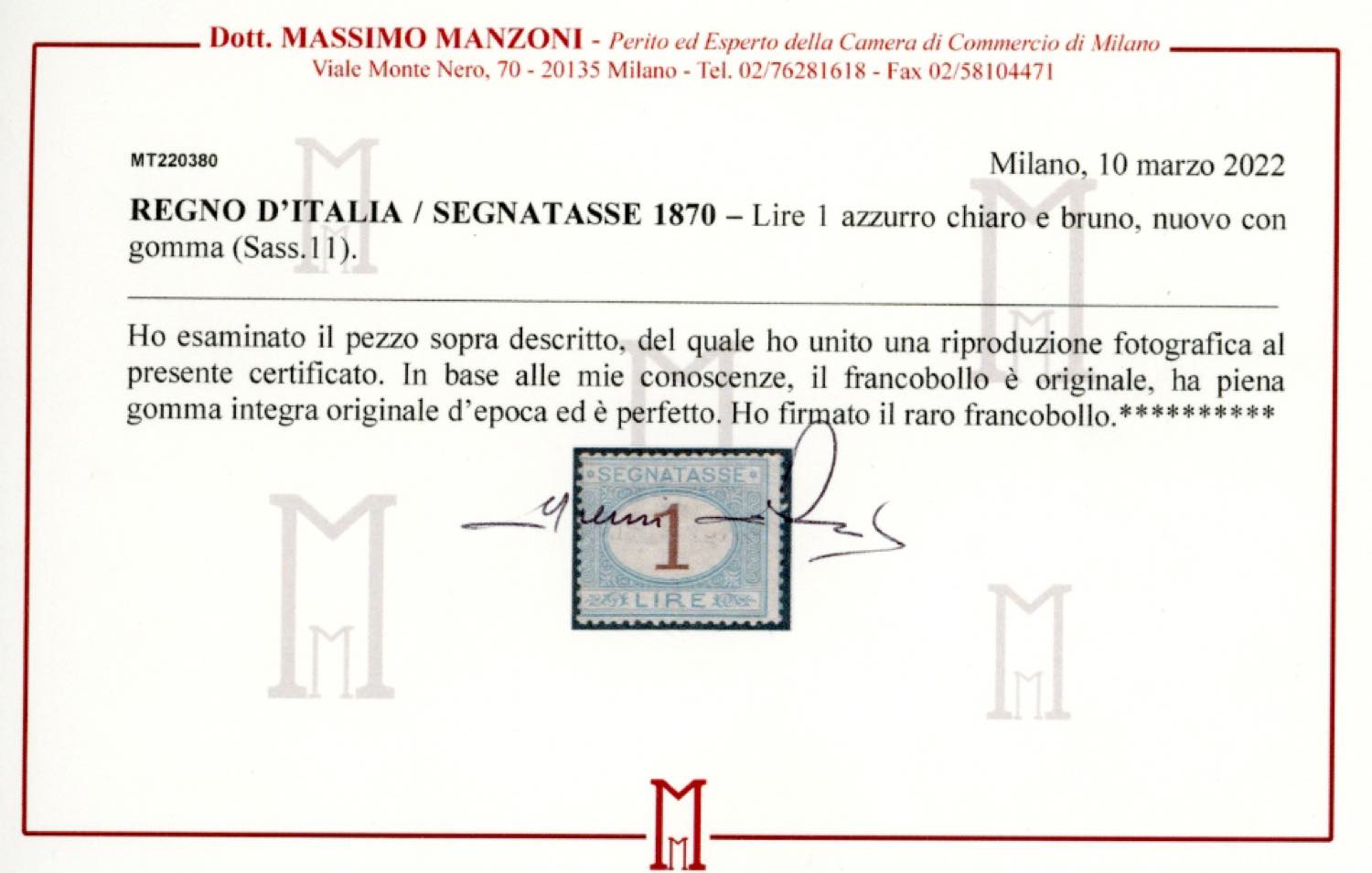 Lotto 1166 - 1870 - 1 lira azzurro chiaro e bruno (11), gomma originale ...