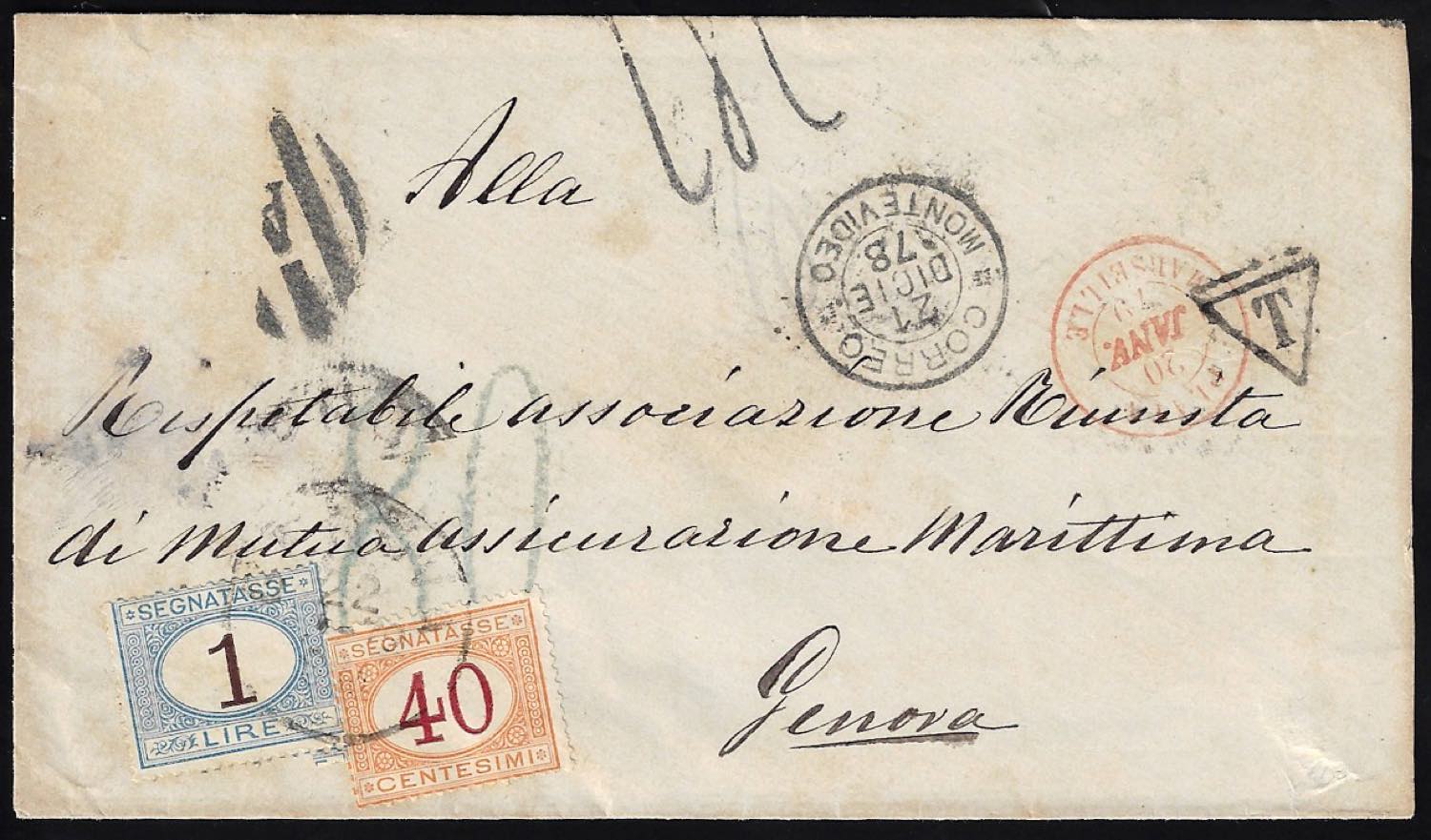 1878 - 1 lira azzurro chiaro e bruno, 40 cent. ocra e carminio (11,8), perfetti, su busta non affrancata da Montevideo 21/12/1878 a Genova.