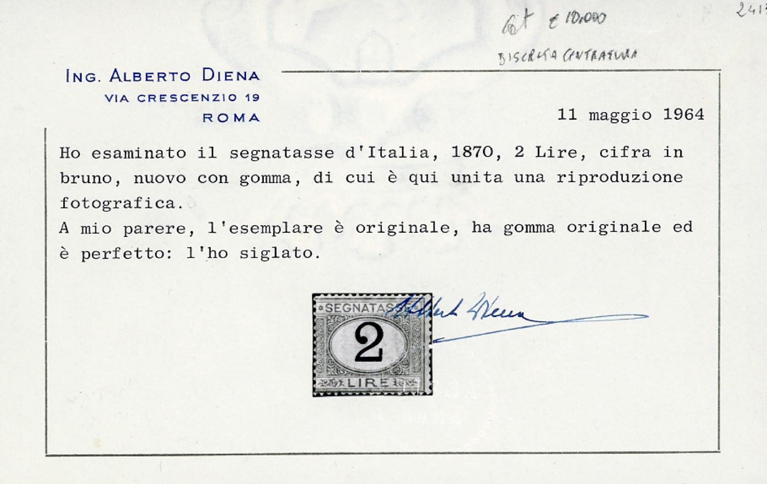 1870 - 2 lire azzurro chiaro e bruno (12), discreta centratura, gomma originale, perfetto. Raro! Cert. A.Diena.