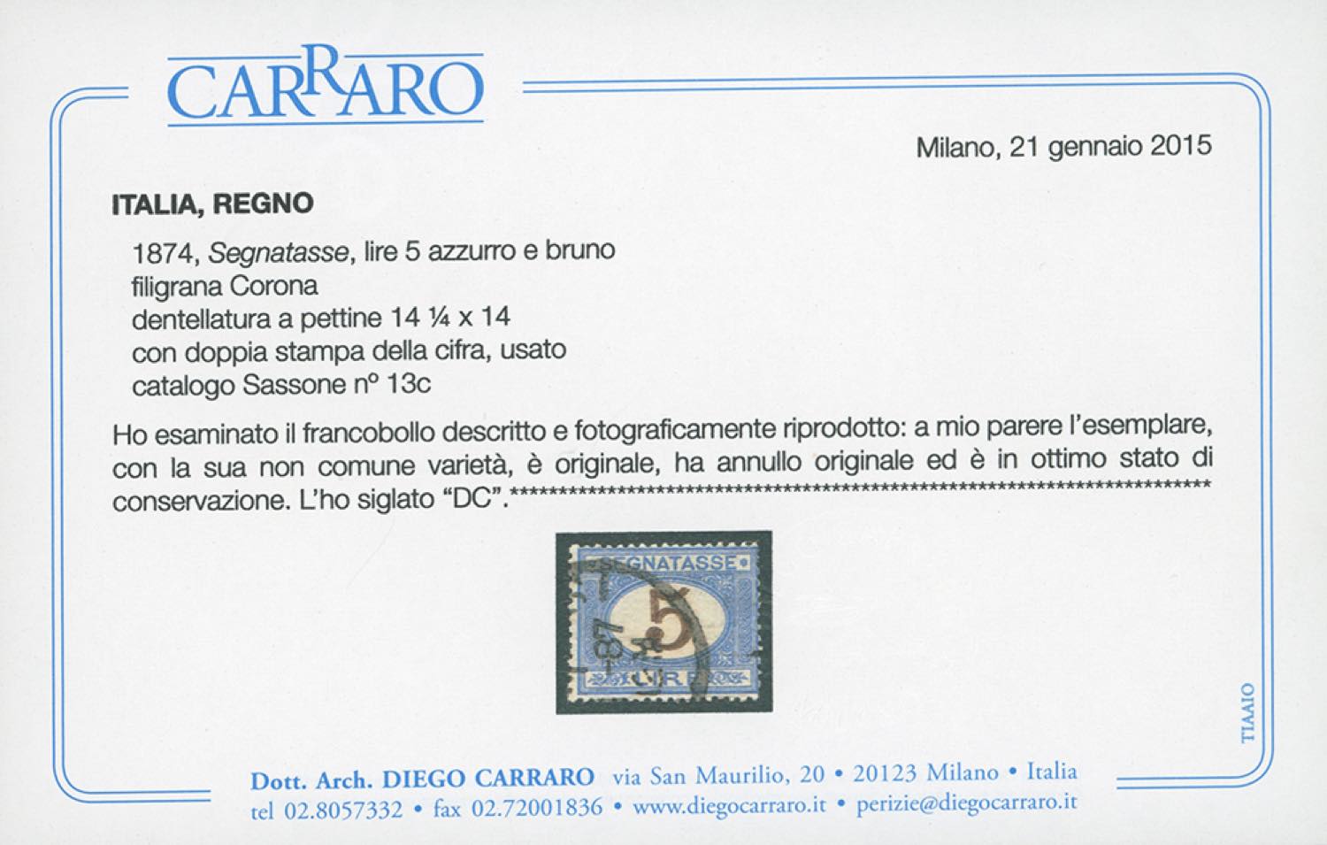 1874 - 5 lire azzurro e bruno, doppia stampa della cifra (13c), usato, ottimo stato. Raro. Cert. Carraro.