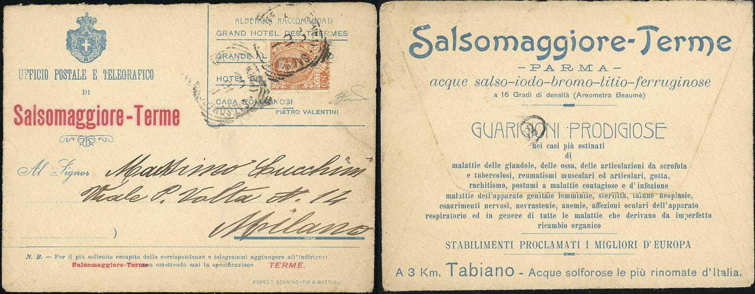 1902 - 20 cent. Floreale (72), perfetto, usato su busta pubblicitaria/parlante edita dall'Ufficio Postale di Salsomaggiore Terme, da Salsomaggiore 1/10/1902 a Milano. Rara e da ritenersi una busta parlante. Cert. Ferrario.
