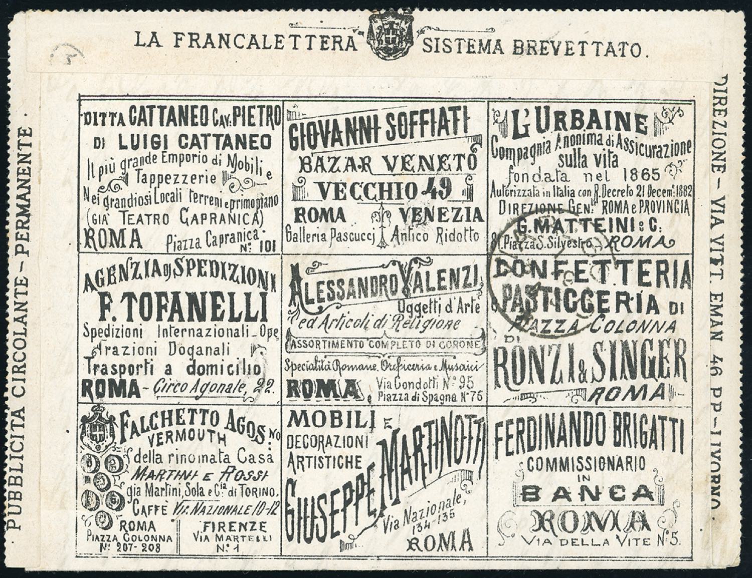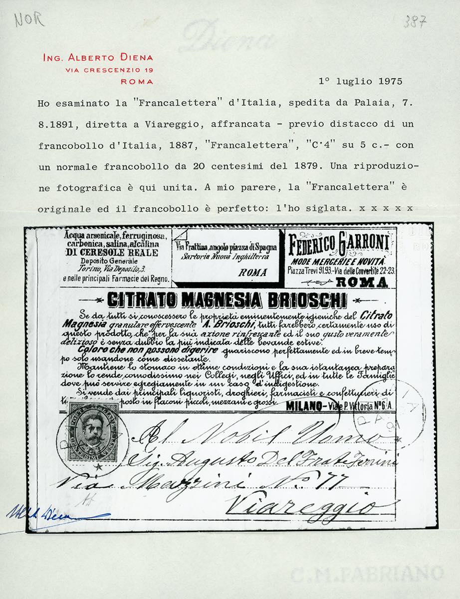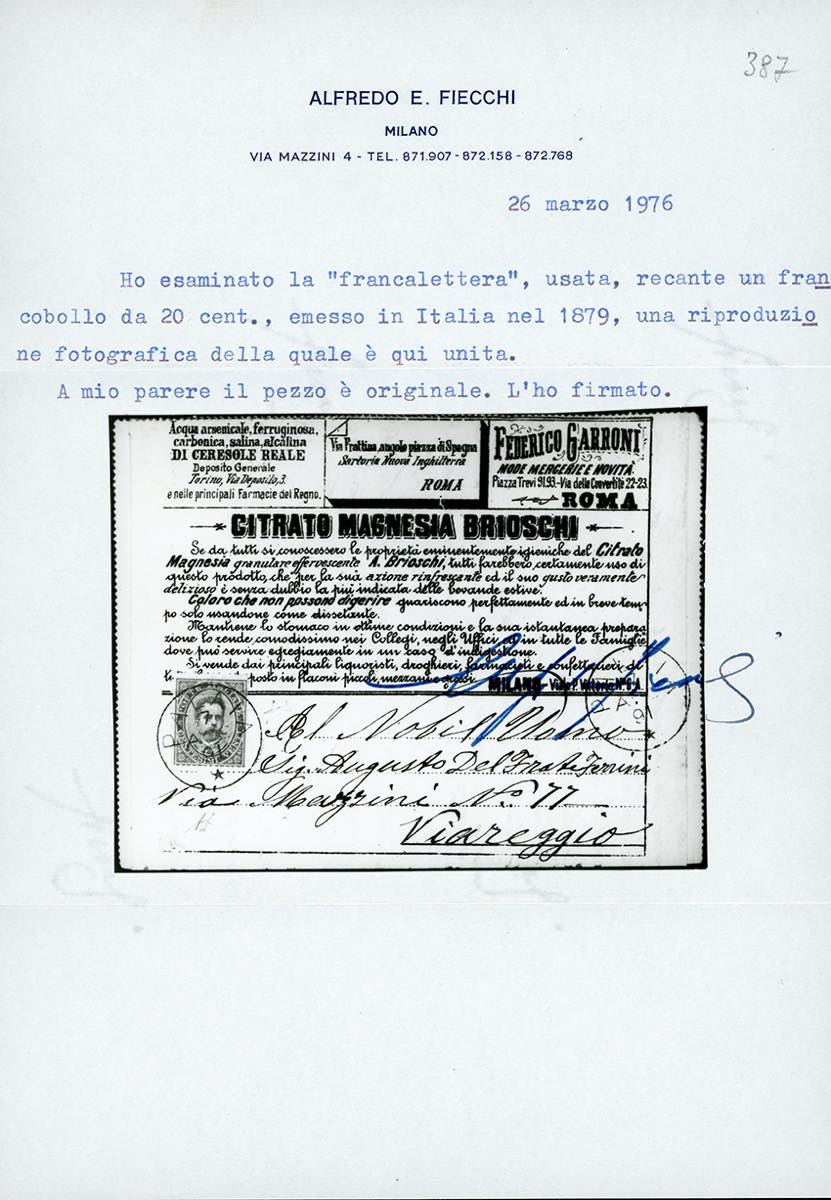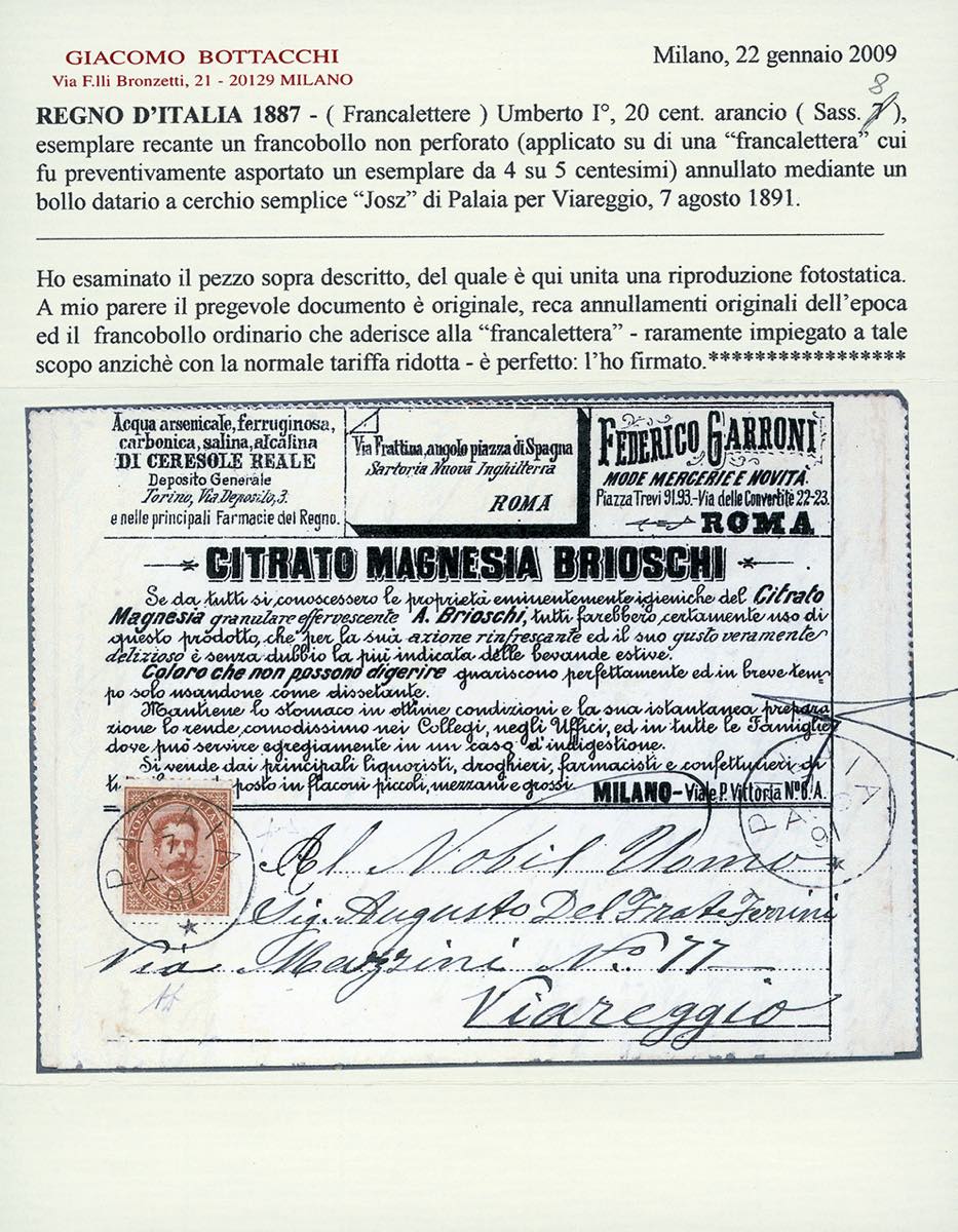1891 - 20 cent. Umberto I, non perforato (8), perfetto, usato su Francalettera da Palaia 7/8/1891 a Viareggio. Raro uso di francobollo ordinario! Cert. Diena, Bottacchi, Fiecchi.