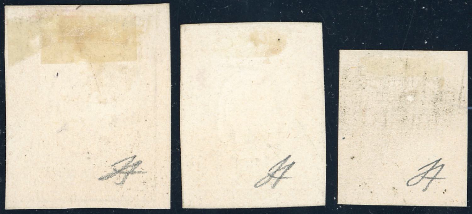 1861 - Saggi Perrin, tre esemplari di colori diversi solo con le diciture verticali su carta spessa (Unificato 2), senza gomma come sempre, perfetti. Rari. Cert. Ferrario.