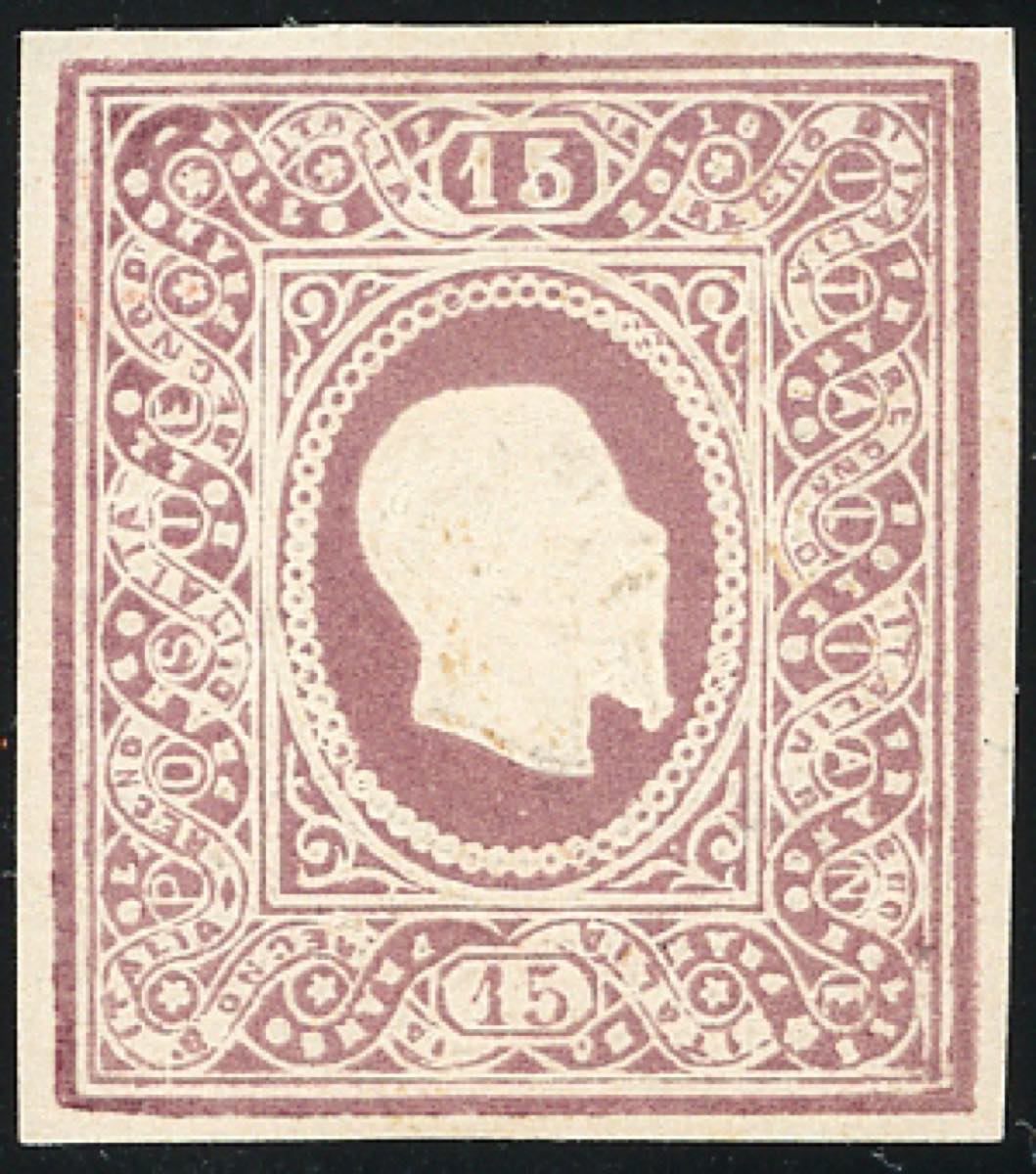 Lotto 1256 - 1864 - 15 cent. Saggio Re, ovale riquadrato, bruno porpora ...