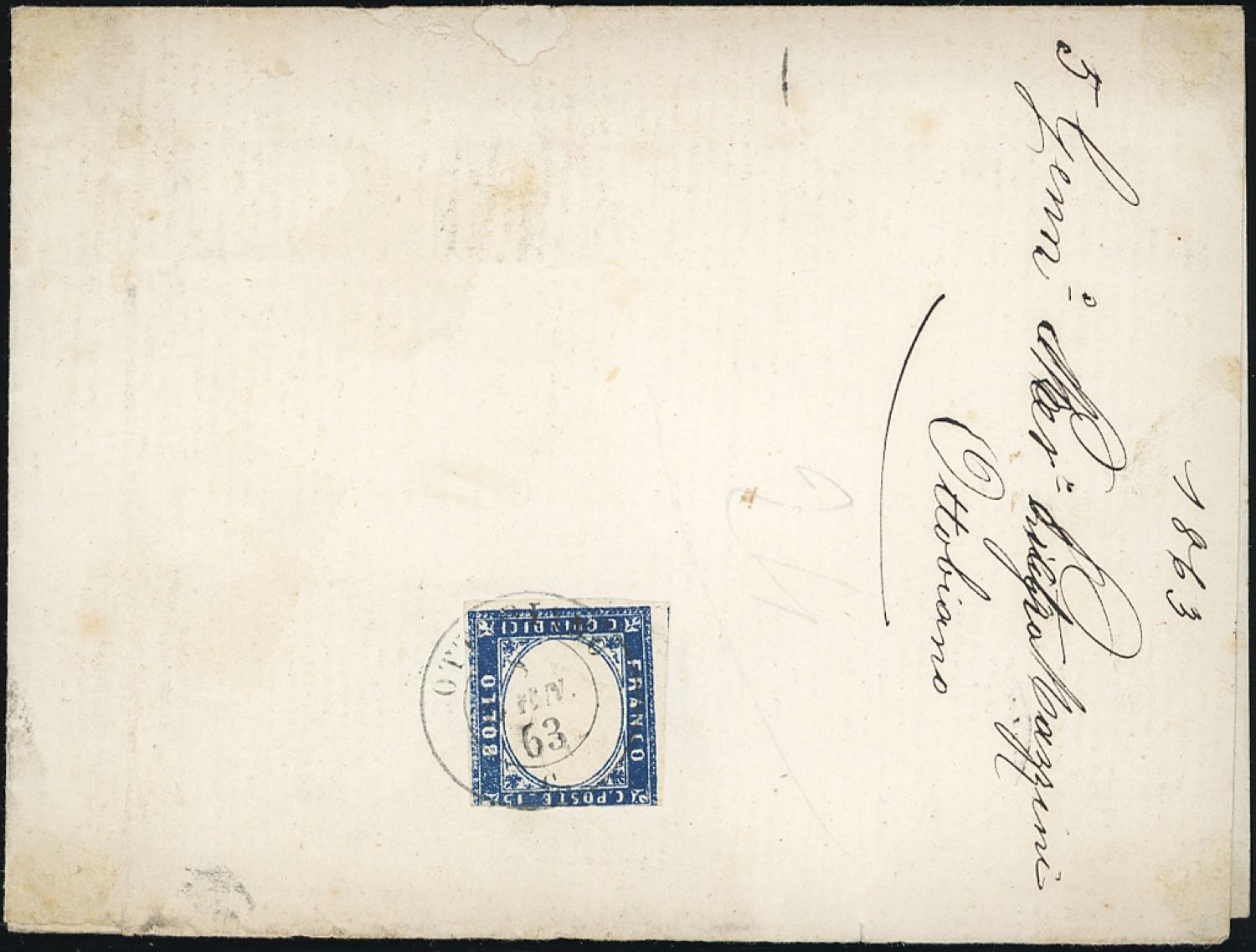 OTTOBIANO punti 13 - 15 cent. (11), leggermente corto in alto, su involucro di lettere dell'8/1/1863. Documento da studiare, raro annullo.