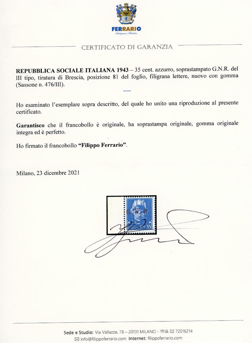 1943 - 35 cent., soprastampa G.N.R. del III tipo, tiratura di Brescia, filigrana lettere, pos. 81 (476/III), bordo di foglio, gomma originale integra, perfetto. Cert. Ferrario, fotocopia cert. Sirotti e Andreoni del blocco di provenienza.