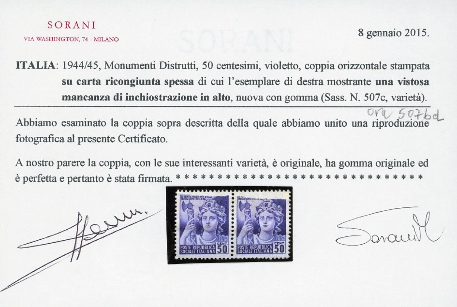 1944 - 50 cent. Monumenti Distrutti, coppia orizzontale stampa incompleta in alto poiché provenienti da stampa su carta ricongiunta (507bd), nuova, gomma originale integra, perfetta. Molto bella ed estremamente rara! Chiavarello, Ferrario, cert. Sorani.