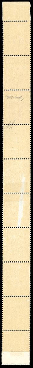 1944 - 75 cent. Tamburino, senza filigrana, striscia verticale di 10 esemplari con dentellatura orizzontale fortemente spostata, il primo valore senza il tassello con le diciture e sette esemplari senza la stampa (508), nuova, gomma originale integra, perfetta. Molto bella e rara, non catalogata. G.Bolaffi, cert. A.Diena.
