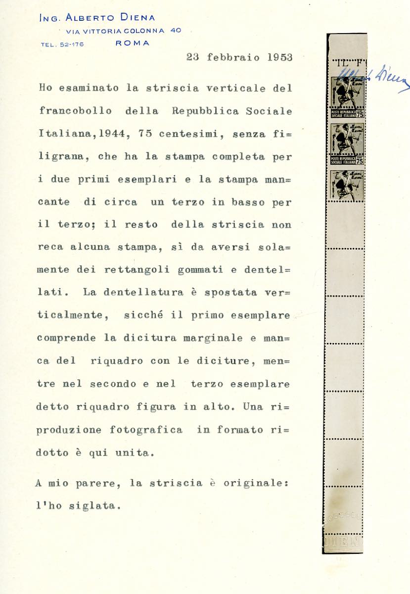 1944 - 75 cent. Tamburino, senza filigrana, striscia verticale di 10 esemplari con dentellatura orizzontale fortemente spostata, il primo ... Leggi tutto