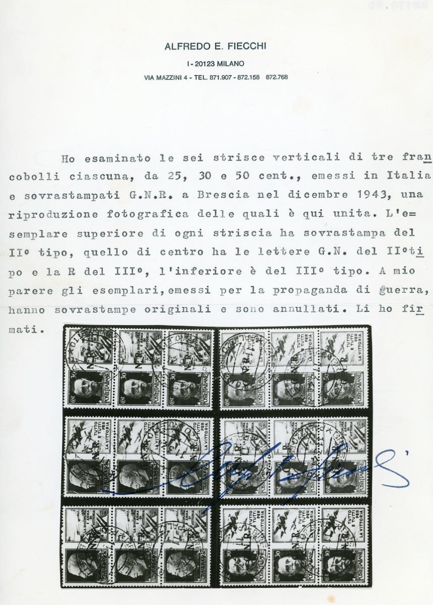1943 - I sei trittici verticali, con le rispettive soprastampe: G.N.R. del II tipo, G.N.R. del II e R. del II tipo, G.N.R. del III tipo (13/II-IIa-III/23/II-IIa-III), usati a Brescia 11/3/1944, perfetti. Si tratta dell'unica serie completa usata, se ne conosce solo un'altra, ma su busta. Rarità. Sorani, cert. Fiecchi, Ferrario.