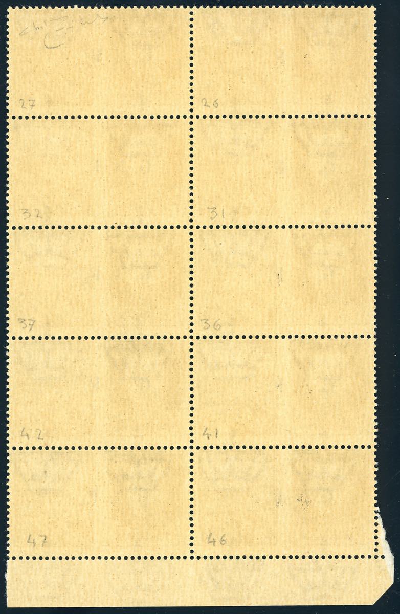 1943 - 30 cent. Marina, blocco di dieci esemplari, posiz. 26/46 del foglio, doppia soprastampa G.N.R. III tipo di Brescia, una debolmente impressa al centro, l'altra spostata sull'effigie (17/IIIc), nuovo, gomma originale integra, perfetto. Insieme di ottima qualità e raro. Ferrario, cert. Oro Raybaudi.