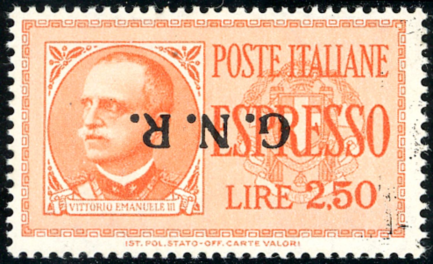 1943 - 2,50 lire soprastampa G.N.R. di Verona, I tipo, capovolta (20a), gomma integra, perfetto. G.Oliva.