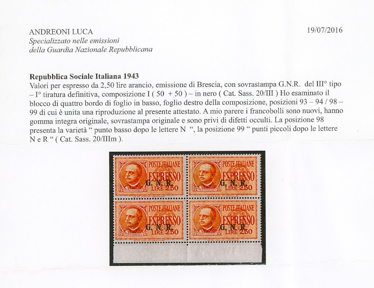 1943 - 2,50 lire soprastampato G.N.R. di Brescia, III tipo, blocco di quattro, l'esemplare pos. 99 con varietà punti piccoli dopo la N e la R (20/IIIm,20/III), bordo di foglio, gomma originale integra, perfetto. Raro. G.Oliva, cert. Sirotti e Andreoni.