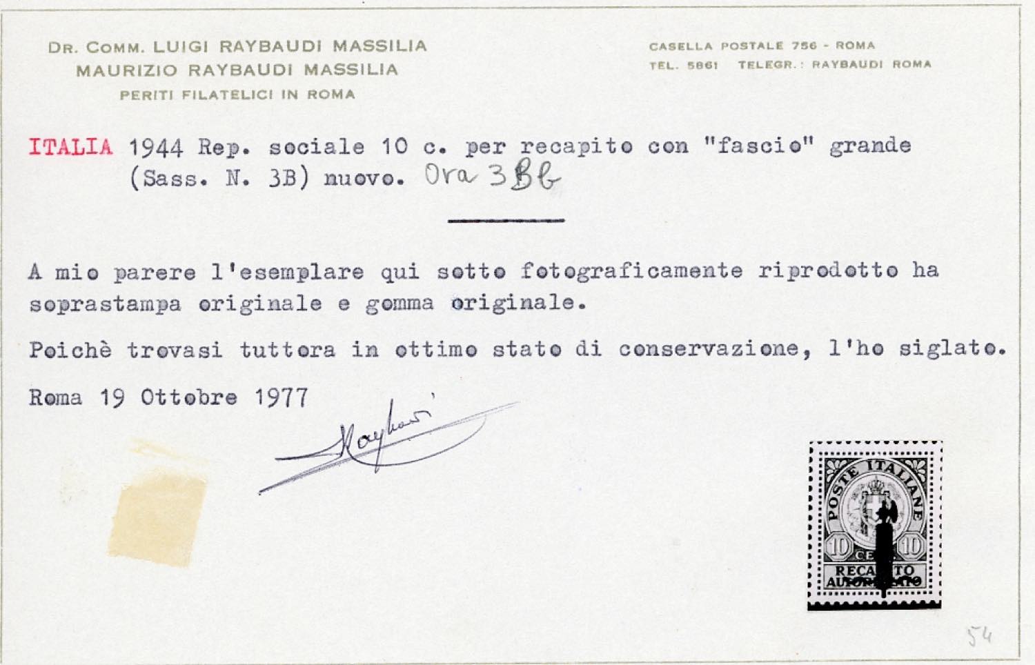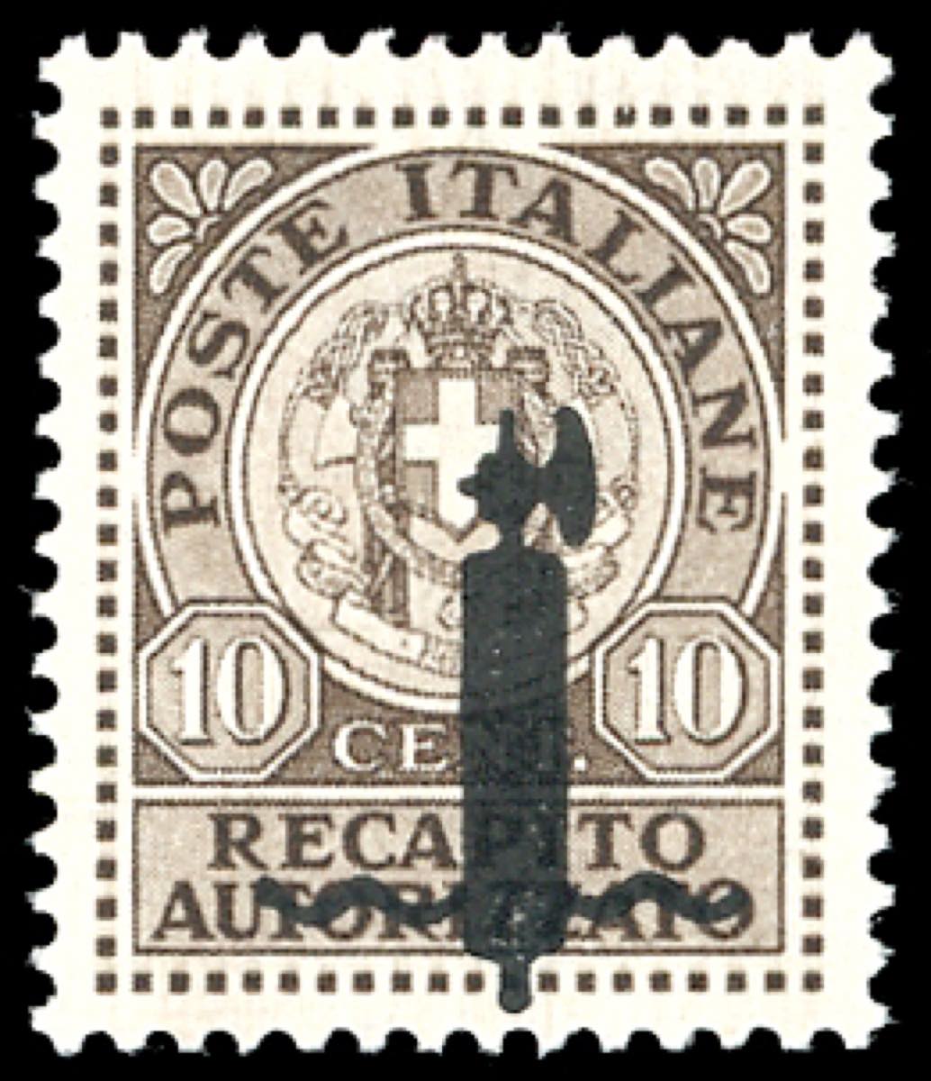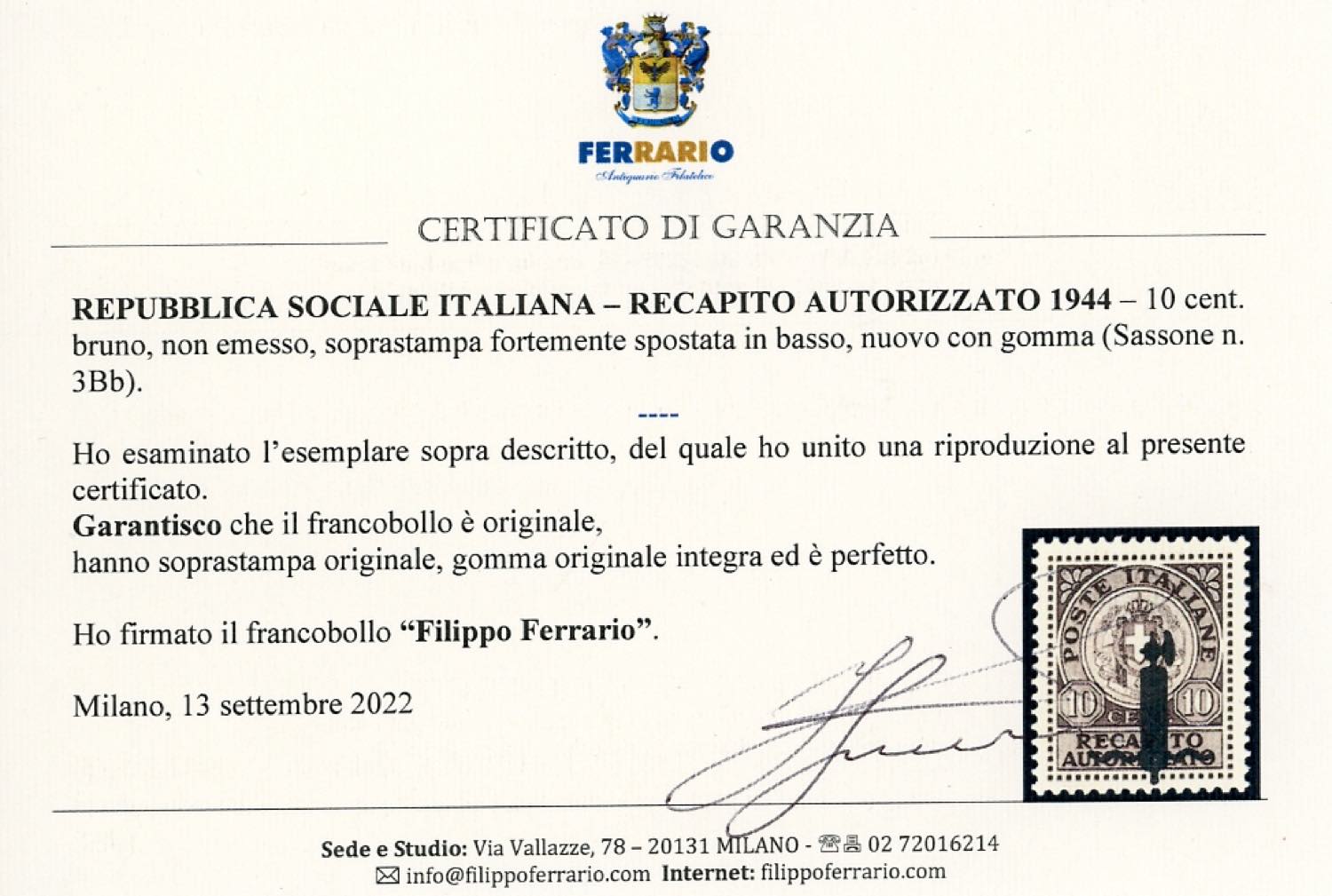1944 - 10 cent. soprastampa fascio fortemente spostata in basso (3Bb), gomma originale integra, perfetto. Non comune. Cert. Raybaudi e Ferrario.