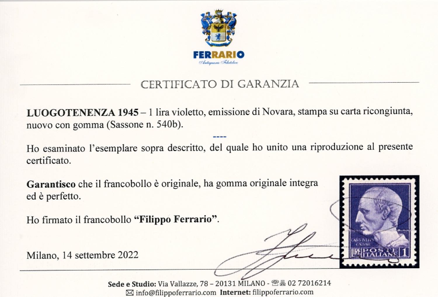 1945 - 1 lira, emissione di Novara, stampa su carta ricongiunta (540b), gomma originale integra, perfetto. Non comune. Cert. Ferrario.