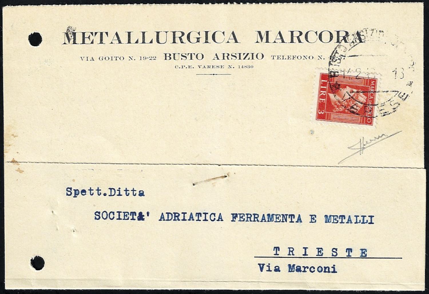 1946 - 3 lire marca da bollo, perfetta, su cartolina da Busto Arsizio 14/2/1946 a Trieste. Rara. Sorani.