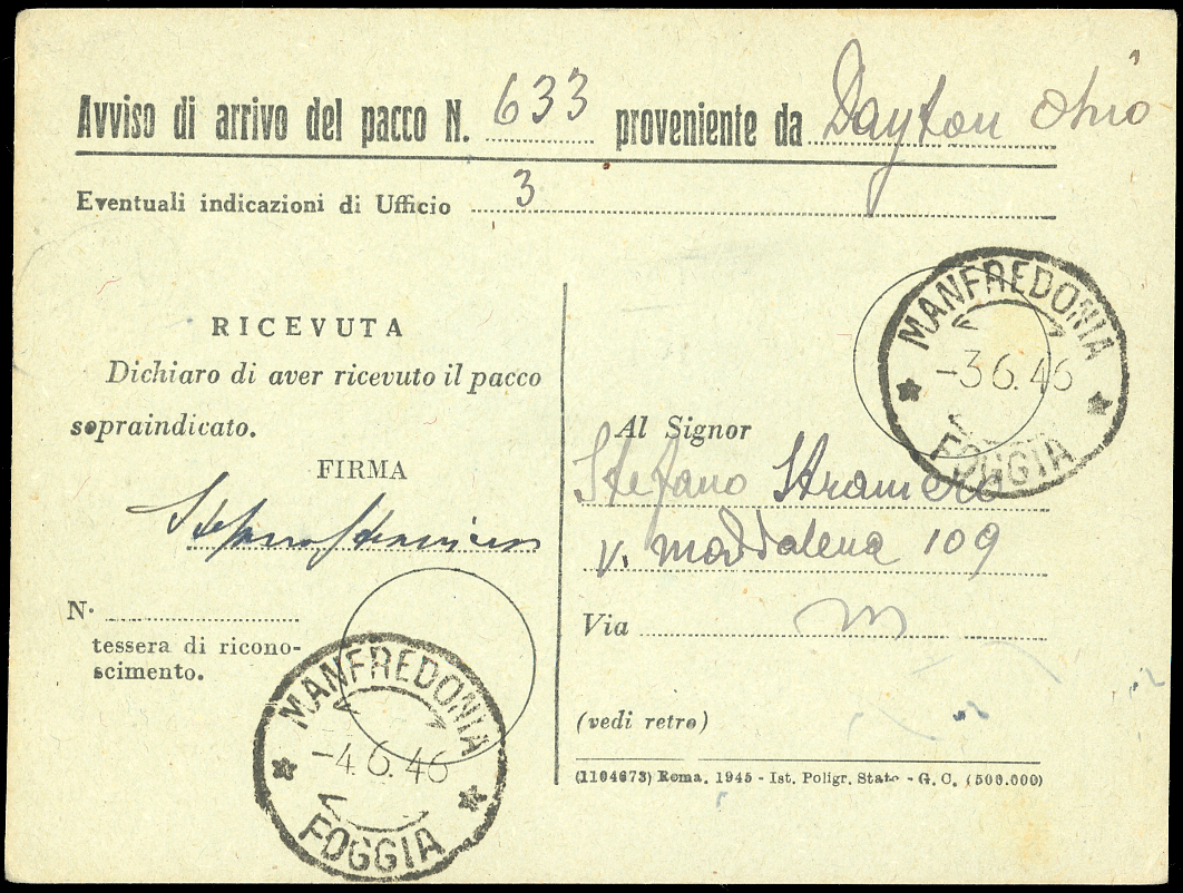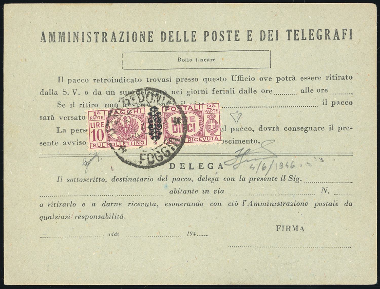 PACCHI POSTALI1946 - 10 lire lilla rosa, soprastampato (58), perfetto, su modulo di ricevimento pacchi, annullato Manfredonia 4/6/1946, durante il Regno di Umberto II. Raro! E.Diena, Ferrario.
